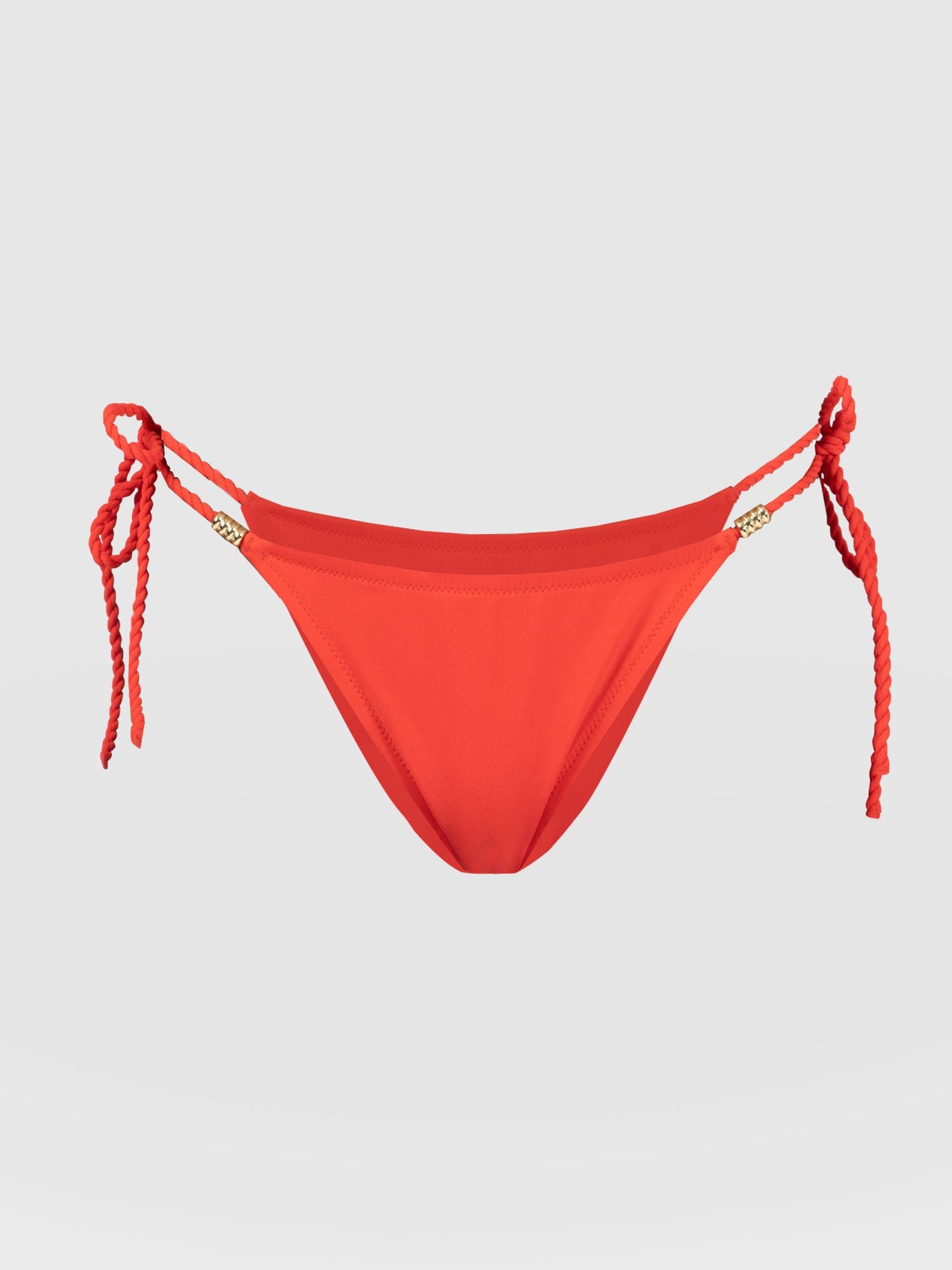 Planet-friendly and infused with a tropical aesthetic, the Alba Bikini Bottom in red is set to be your new swimwear go-to. It’s shaped from recycled polyamide and features adjustable tie sides to help you create the perfect fit with a low-rise with mid-coverage to ensure you achieve maximum sun exposure for tanning. Then, they’re trimmed with gold-toned hardware for a glimmering and elegant finish.