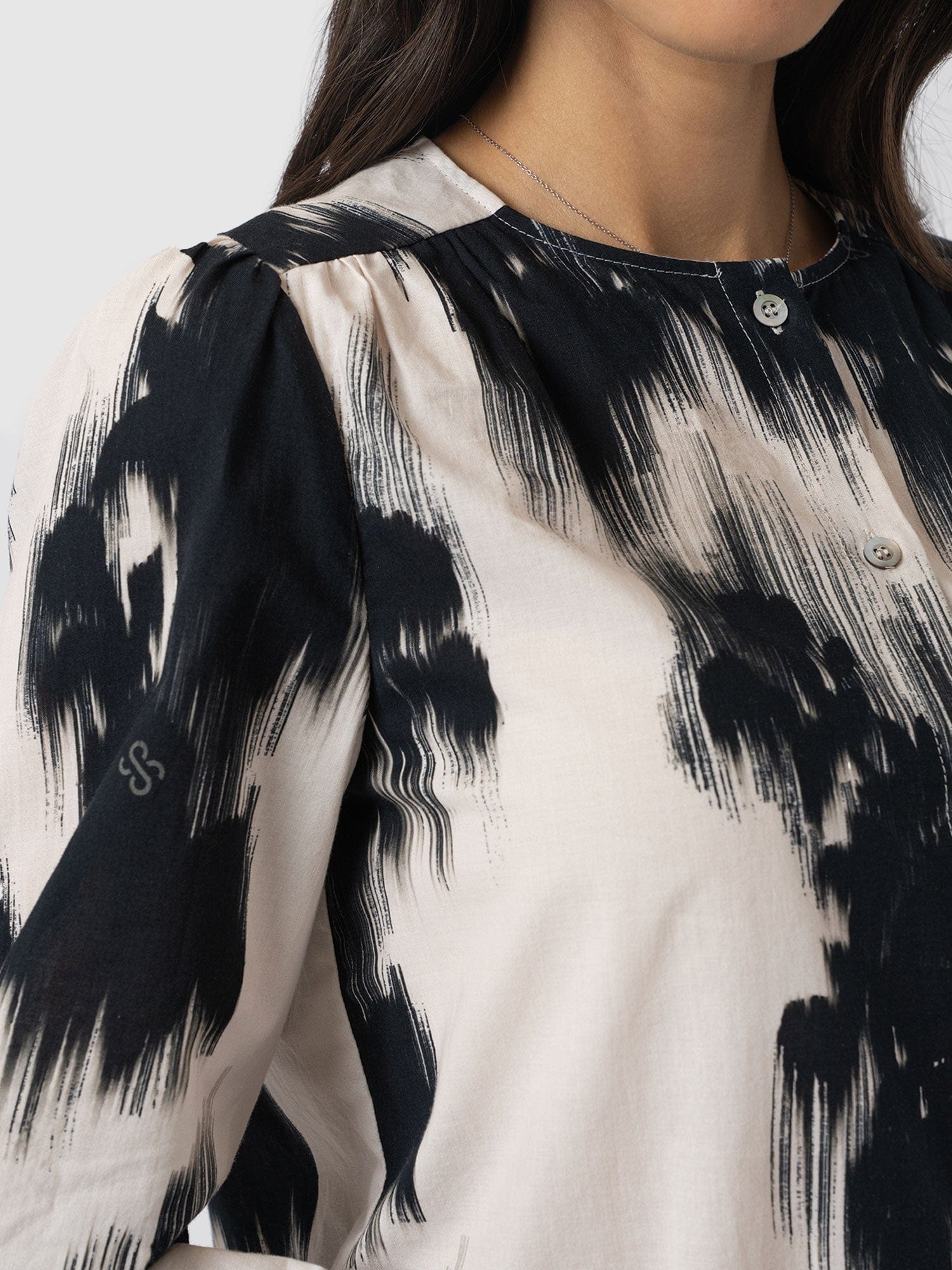 Meet the Amelie Blouse. This button-through style is handmade by our artisans in Europe using a beautifully lightweight cotton voile. It’s topped by a crew neckline and falls to long billowy sleeves that cuff at the wrist with branded gunmetal buttons. As for the print, the monochromatic florals offer a sophisticated take on seasonal blooms. Wear yours with our Keller Trousers and boots, or dress it down with a pair of Bowie Jeans.