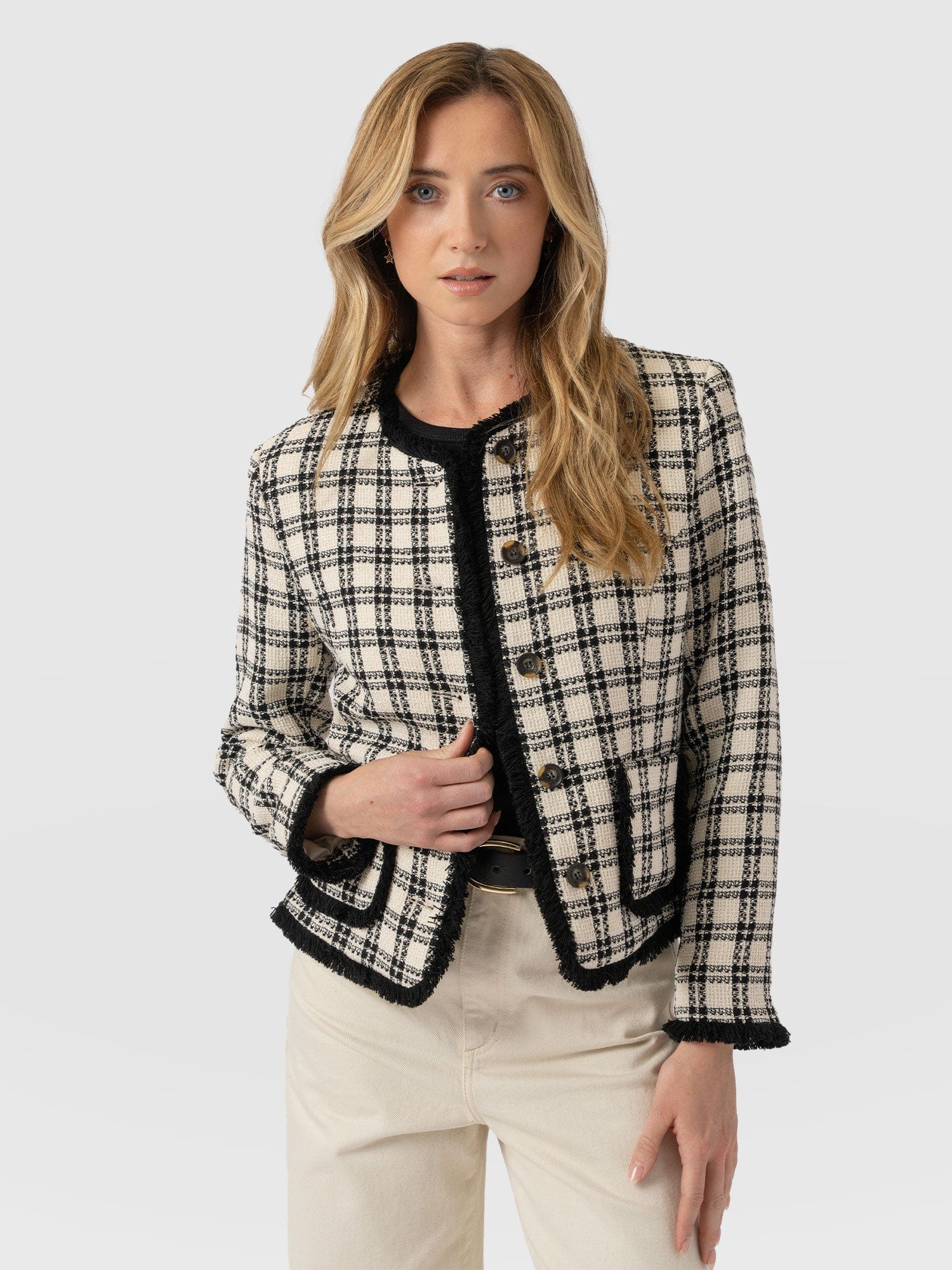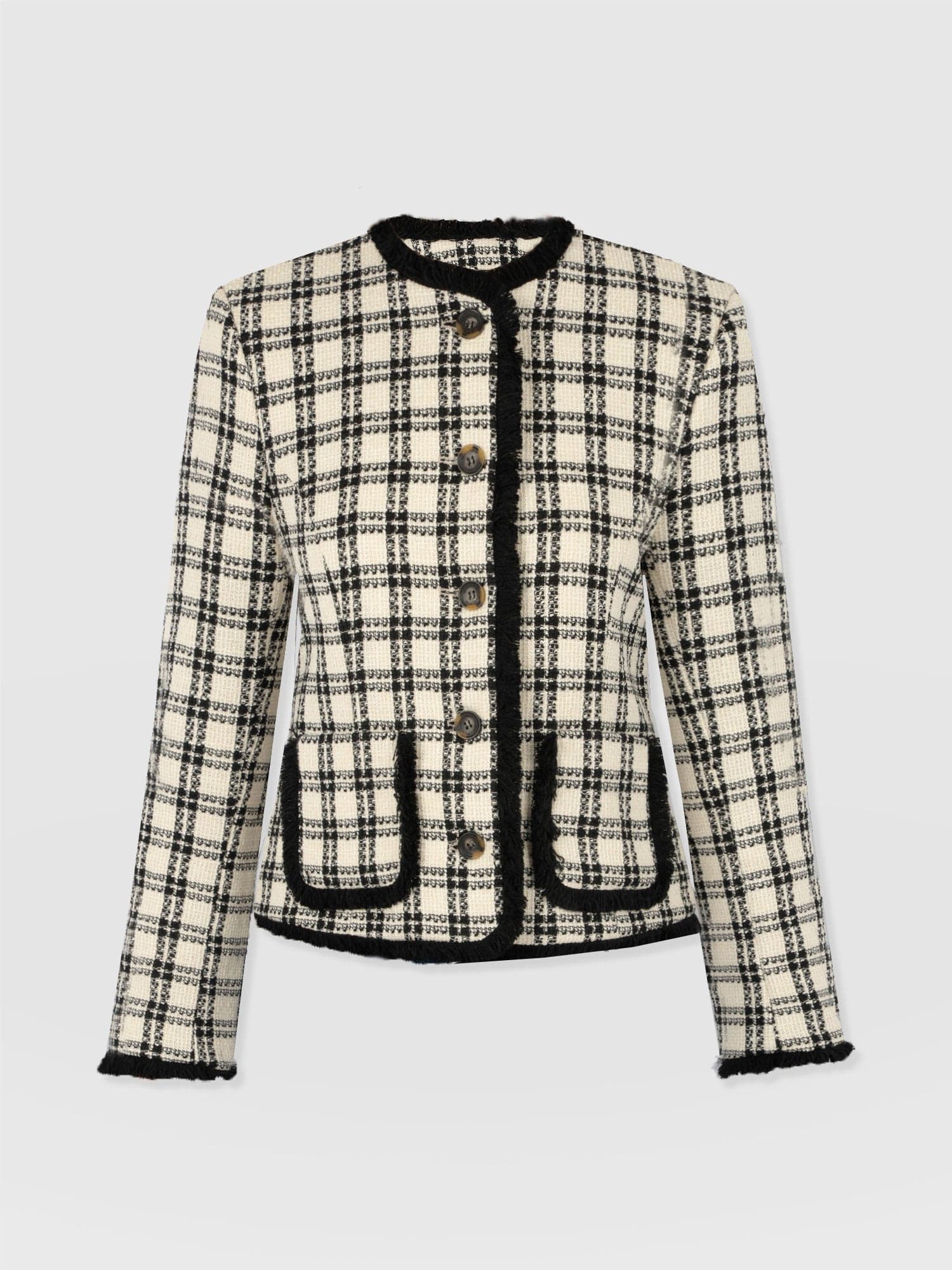 The Ashby Jacket is a fitted, button-through style with a chic edge. It’s masterfully handmade by our team of skilled artisans in Europe using a durable material that boasts a sophisticated boucle finish. At the trims, frayed hems help to add a distressed edge for a more contemporary look. Style yours with a pair of tailored pants for the perfect evening look this season.