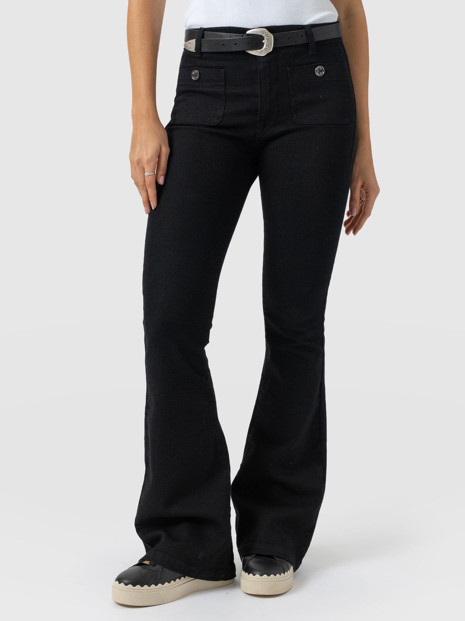 A classic flared jean in jet black with some stretch for a stylish, vintage look. Perfect for work or weekends, these flared jeans have a flattering fit with a high waist and patch pocket detail. Each style is designed in our London studios and hand made in Europe. Wear back with our Riviera Tee, Cambridge Blazer and heels for a night out look.