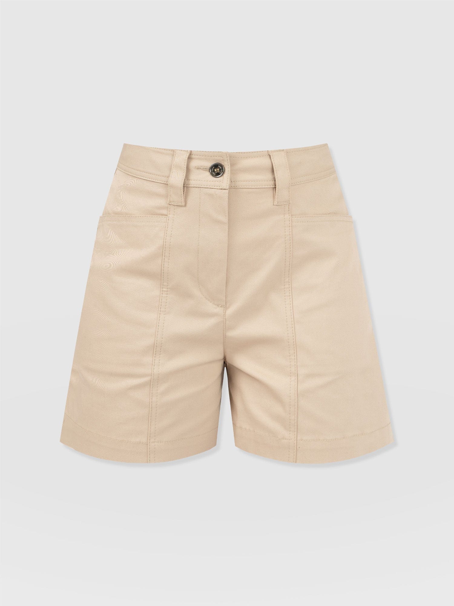 A pair of fitted cargo shorts in beige made from organic cotton and infused with a hint of stretch for all-day comfort. They’re topped by a high-rise waistband and trimmed with tonal stitching for a casual finish. Each pair is handmade by skilled artisans and features large front pockets to store all your daily essentials. Style yours with a white tee and your favourite sandals to create a relaxed seasonal look.