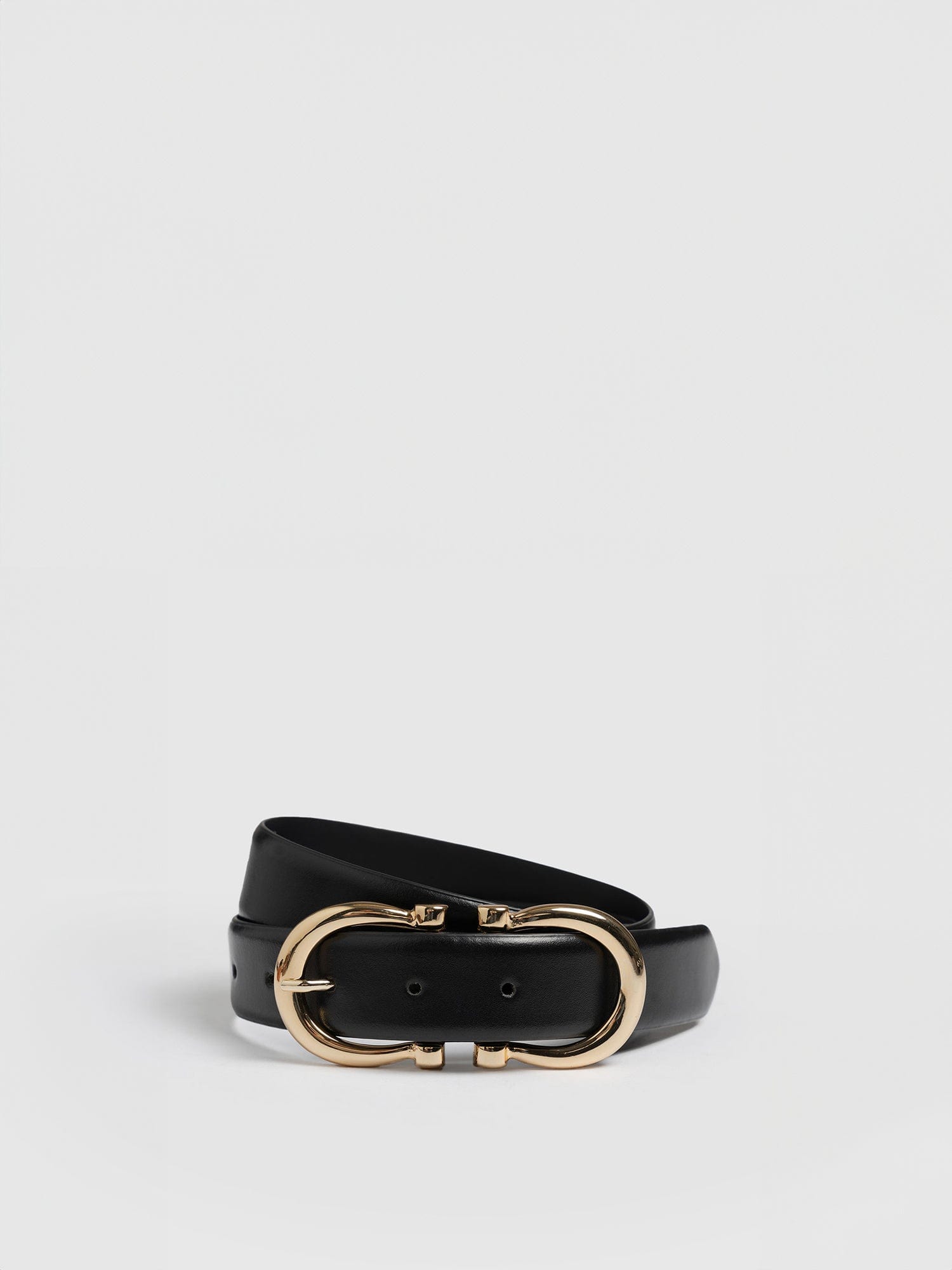A beautiful black belt influenced by the American West. Fitted with a double horseshoe shaped buckle in light gold toned hardware. Hand made in Italy with the finest, natural leather. The adjustable length can be worn with jeans or pants or to add some flair to any dress.