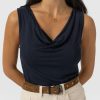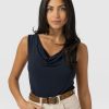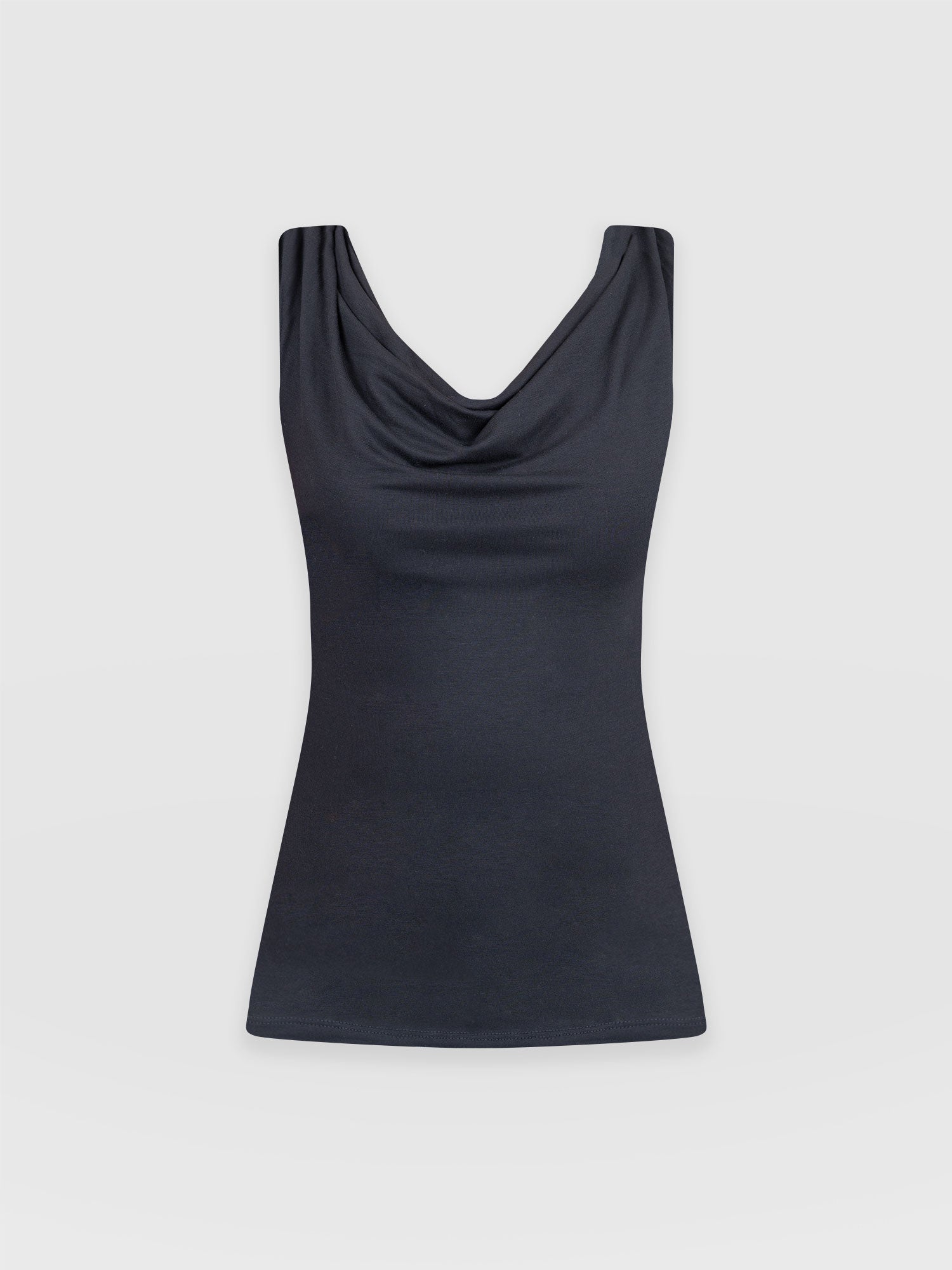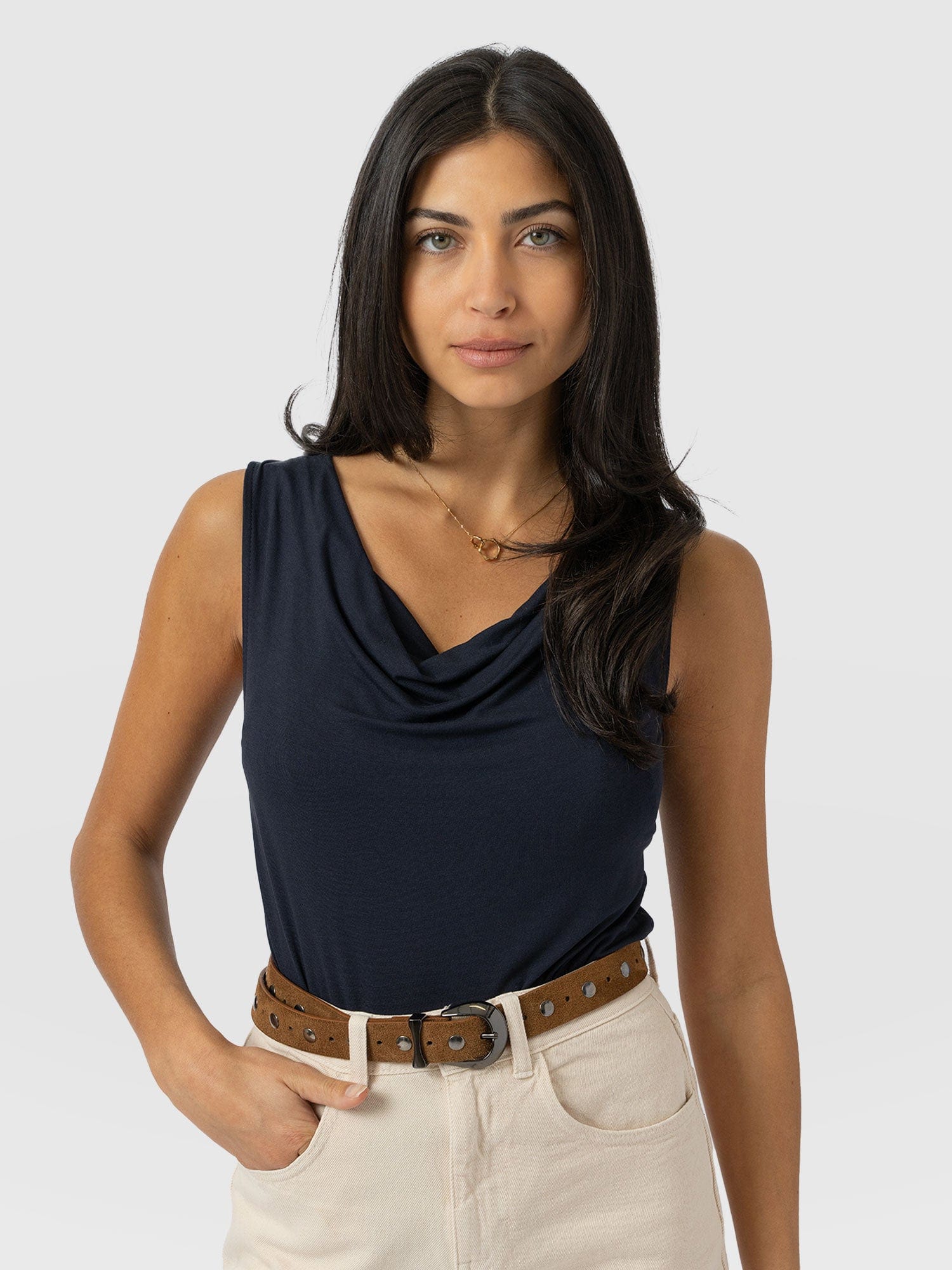 A classic cowl neck cami in navy made for everyday wear. This timeless piece features our beautiful cowl neckline in a new tank style that adds a touch of sophistication to any look. Pair it with our Keller Wide Leg Pant or Cara Wide Leg Culotte, complemented by our Cross Over Slides, and complete the ensemble with our Mini Penny Tote Bag in blue for a pop of colour and functionality.