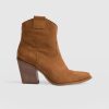 The Dallas Boot in Tan is a classic ankle boot with a western style. Each pair is hand made with a soft suede and finished off with discrete stitching. Immediately comfortable as a slimline ankle boot with pointed toe and chunky heel, this on trend shape works well with anything from dresses, to skirts or jeans.