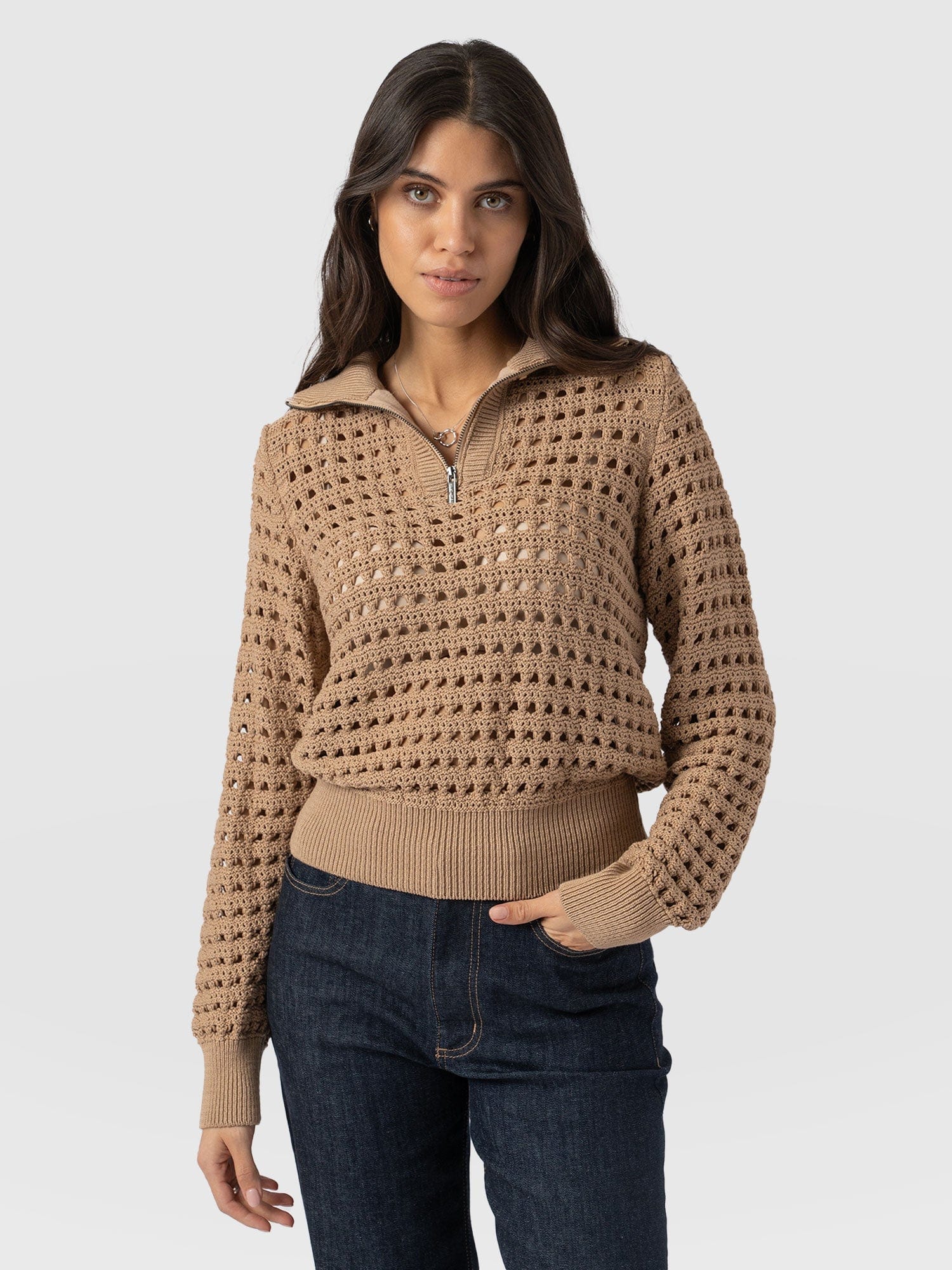 A long-sleeved knitted polo that’s perfect for the transitional months, the Ester Quarter Zip Knit is woven from a chunky viscose material using a soft openwork stitch for a casual finish. Each style is expertly handmade in our family-run studios in Europe and uses deep rib cuffs to create a comfortable silhouette. Use the zipped fastening to switch between necklines, and style yours with the wide-leg jeans and trainers for an on-trend look.