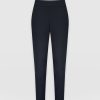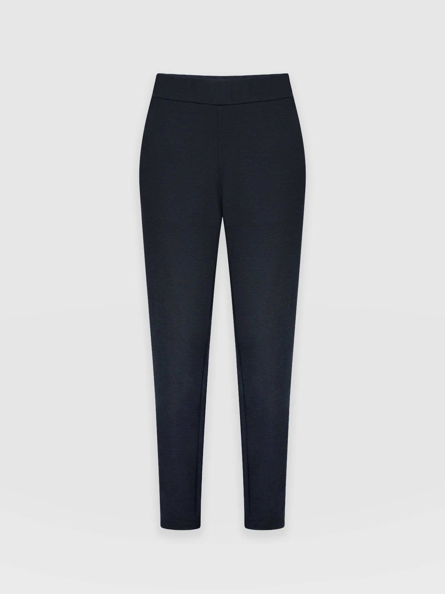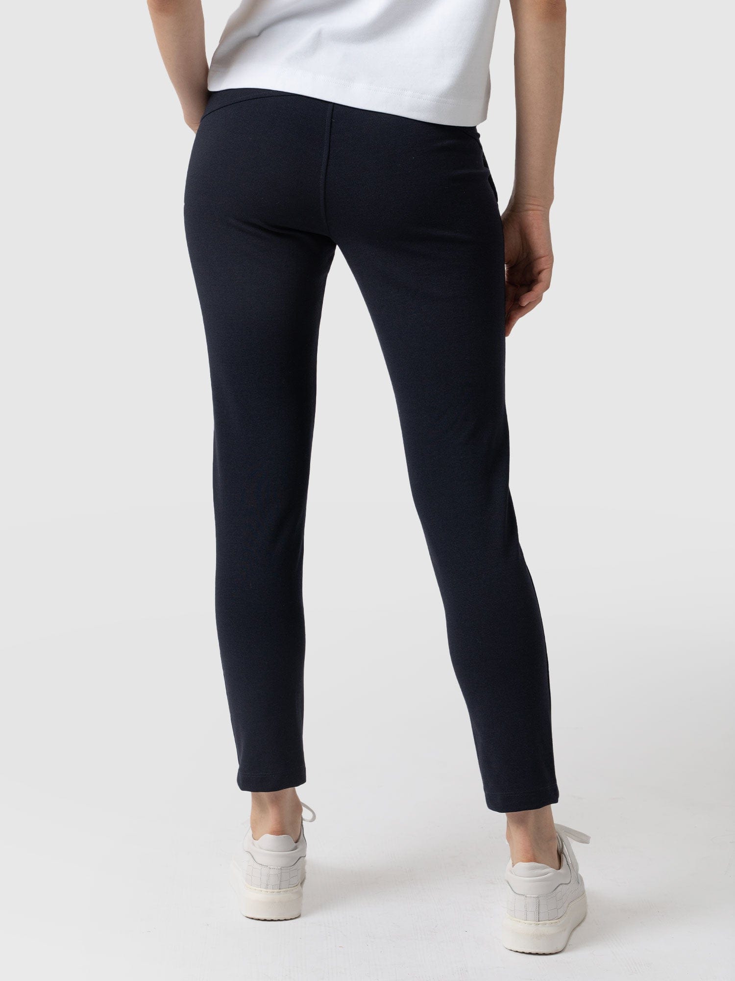 A relaxed pant style in navy with a gentle tapered leg. Mid-waisted with an elasticated waist for comfort. We make each style in our studios in Europe with a soft Ponte di Roma fabric that’s wrinkle and crease free with a beautiful drape. Perfect for work or weekends, easily styled with sandals or sneakers for a more casual look or with boots or heels for more attitude.