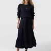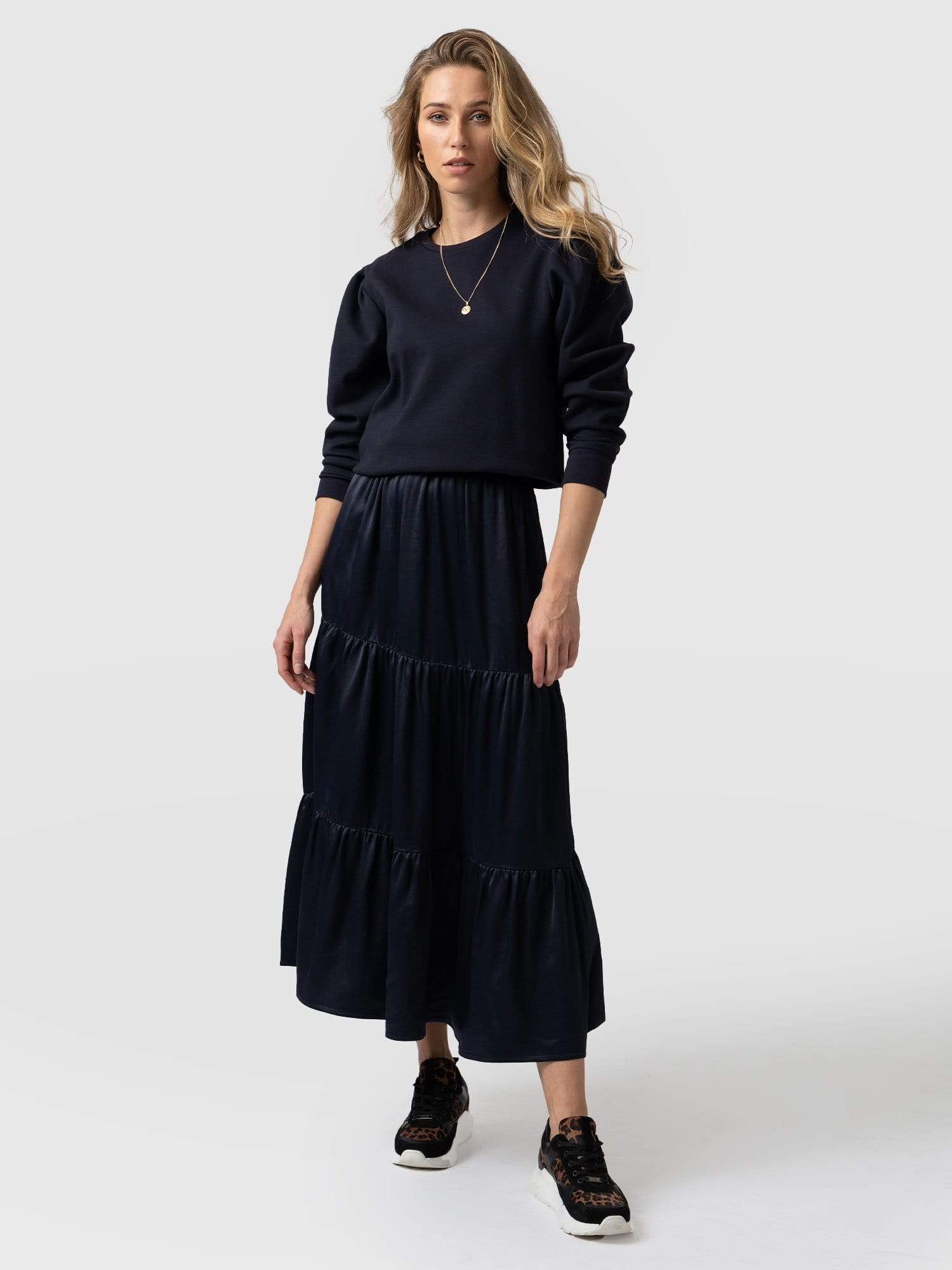 A classic midi skirt in navy viscose with a comfortable fit and feel. We designed this with a midi length and added a zipper for ease of use. It’s made with a soft and silky Lenzing viscose fabric that’s sustainable and has a beautiful drape. We only make a few at a time in our studios in Europe and finish each one by hand. Easily pair with sandals or sneakers for a casual look or with heels for a more formal look.