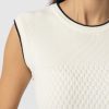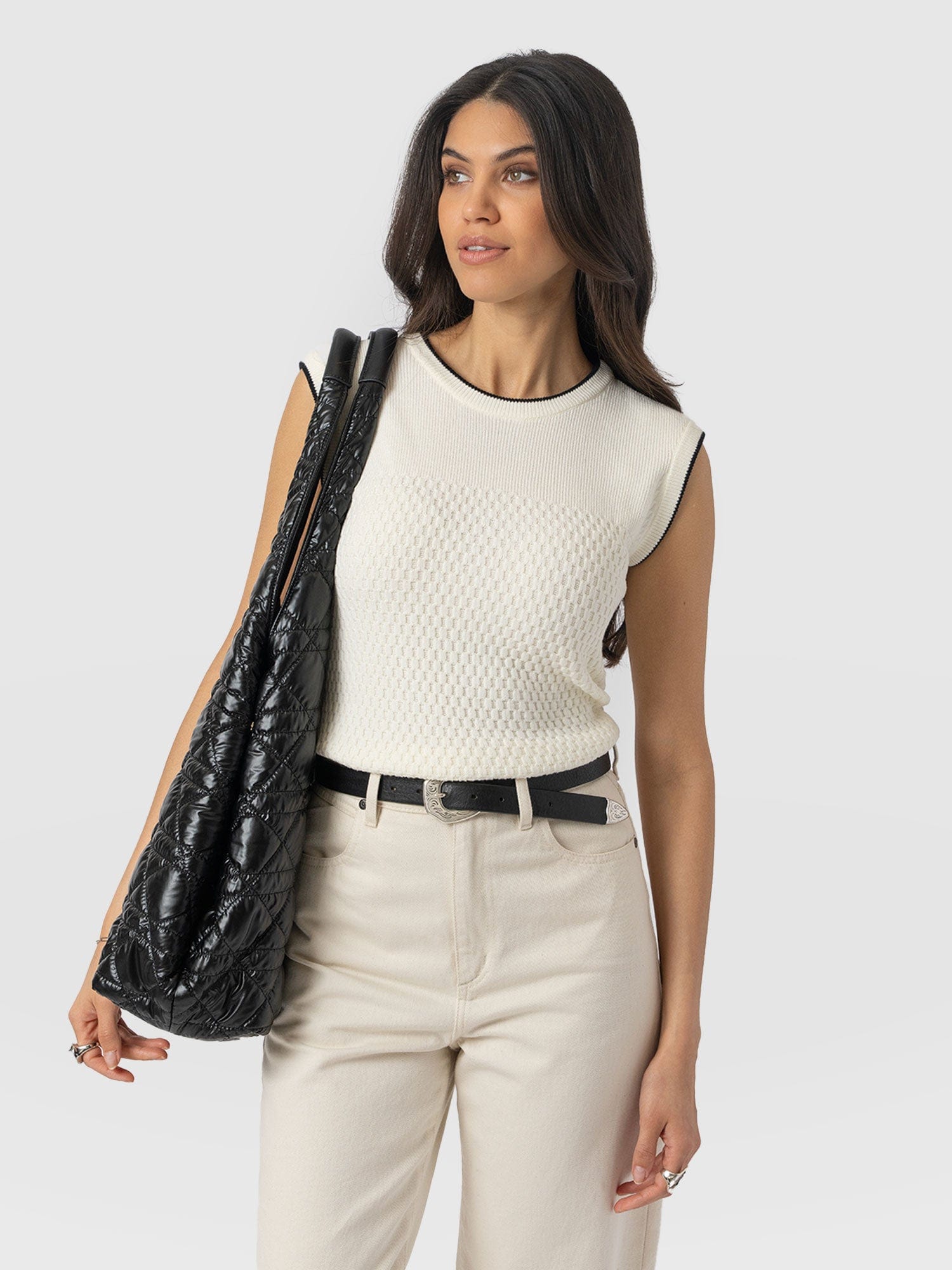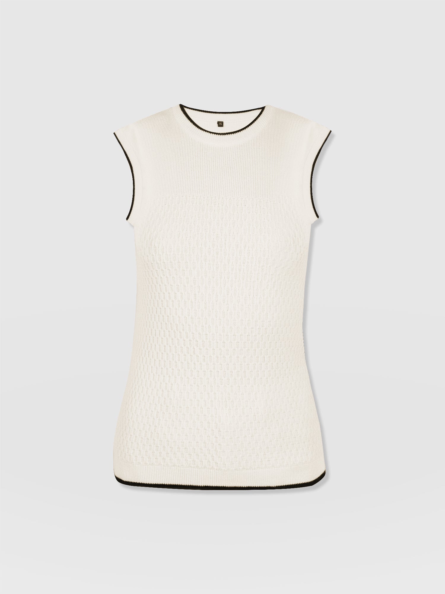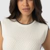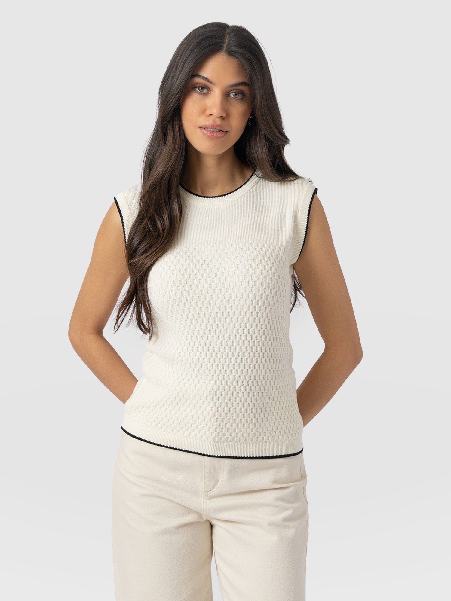 A sleeveless knitted vest with a honeycomb texture for added interest – the aptly named Honeycomb Sleeveless Rib Knit is the perfect transitional style to add to your collection. It’s designed in our London studios and handmade by our artisans in Europe, who use a soft and gentle weave to create a lightweight knit finish. At the trims, a contrasting stitch adds a final flourish. Wear yours with our Barrel Leg Jeans and slides to complete the look.