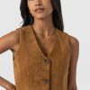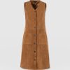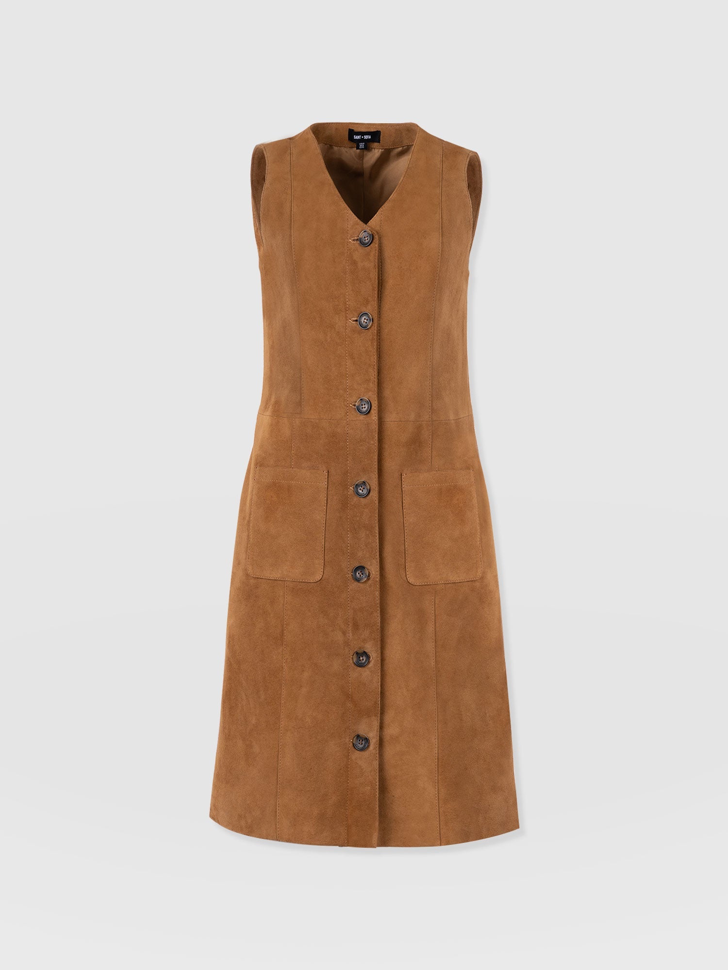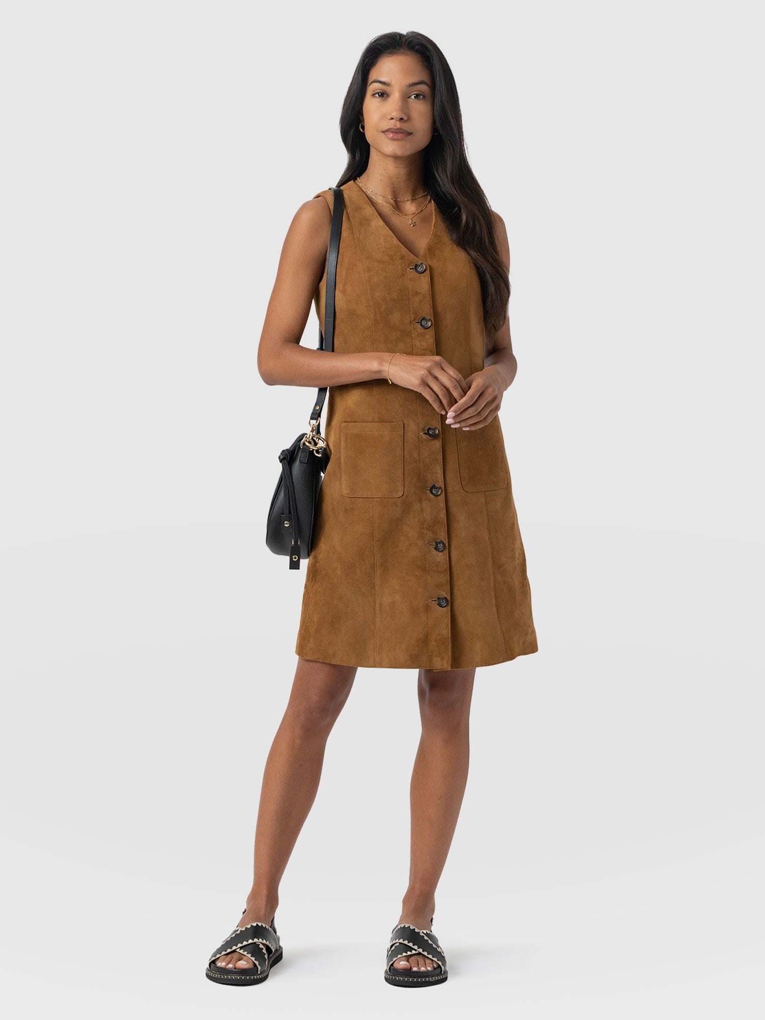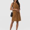 Designed with city style and transitional layering in mind, the Luther Suede Mini Dress in Camel is a suede rendition of the classic pinafore dress. It’s beautifully cut to a sleeveless silhouette and boasts a V-neckline with a front button closure. The carefully stitched seams help shape and define your figure, and the front patch pockets provide practical functionality. Style yours over a white blouse with boots, or for something more playful, try a patterned Austen Tee.