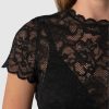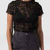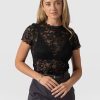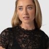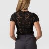 Upgrade your evening wear wardrobe with the sophisticated Miranda Lace Short Sleeve Tee – a perfect choice for any party. Made with gorgeous and luxurious floral black lace, it works beautifully when layered over your favourite black cami – or for something more daring, opt for a tonal bralette. Pair with a full skirt for a glam look or black pants and a leather jacket for a more edgy mood.