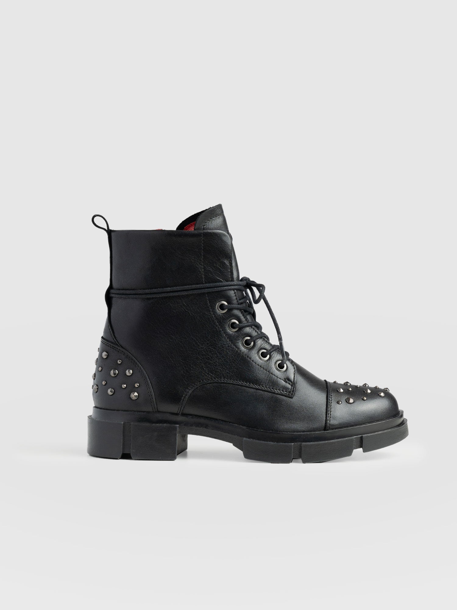 A studded tie-up boot in black handmade in Portugal using the softest leather and a chunky rubber sole. We only make a few of the Noho boots at a time to ensure every detail is finished to the highest quality. They have a wider fit to ensure you stay comfortable even after hours of walking, and they’re structured with a timeless design that you’re sure to be wearing years from now. Style them with pants, skirts, or dresses to create an on-trend look.