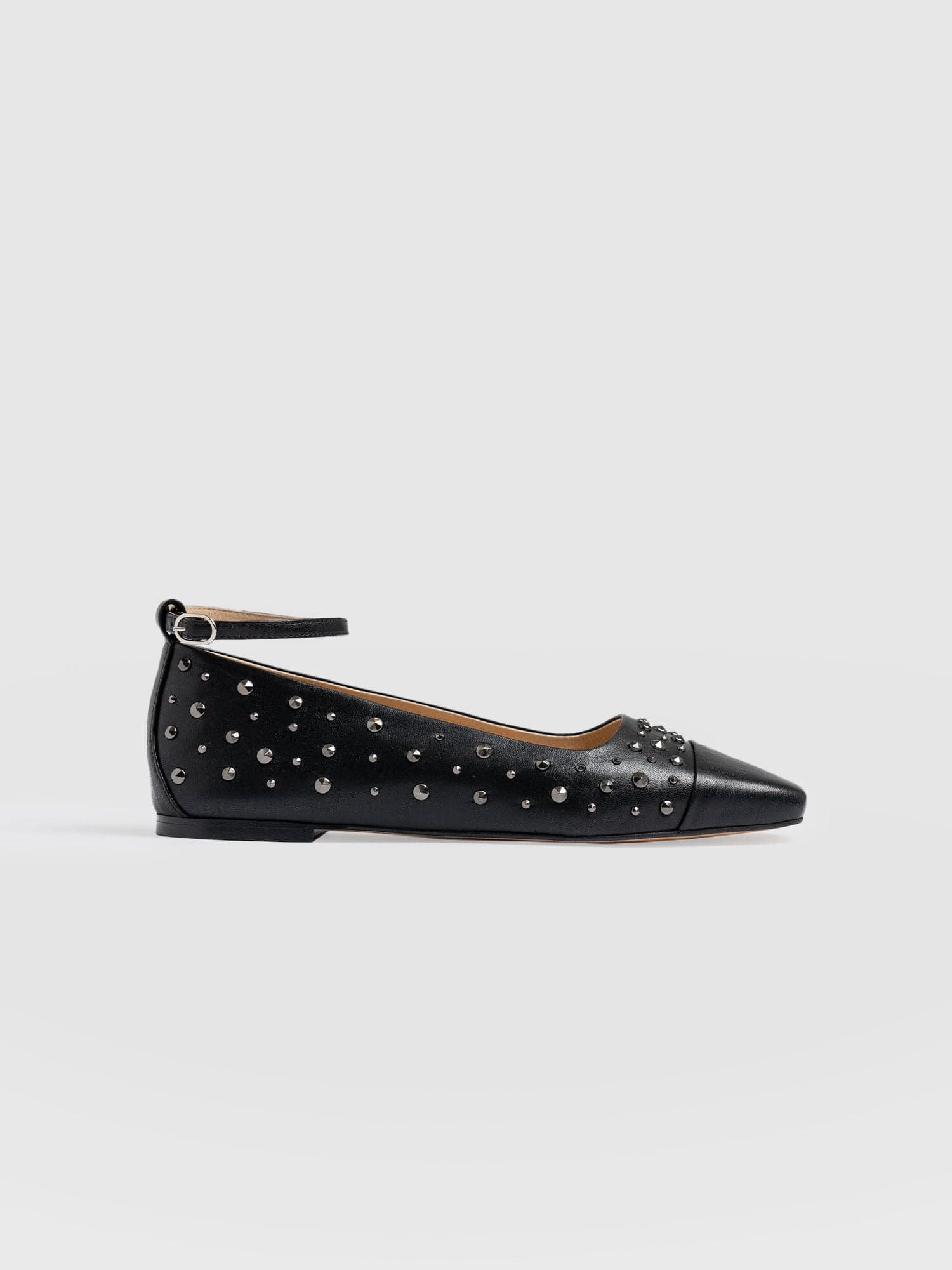 Meet the Ophelia Studded Leather Ballerinas in black. Crafted from premium leather finished with eye-catching studs. Expertly made in Portugal, these flats offer both style and comfort. The ankle strap adds a touch of sophistication while providing a secure fit for all-day wear. Use the glimmering metal studs to elevate your shoe collection and let the ballerina aesthetic effortlessly complement any outfit – from casual garden parties to formal balls.