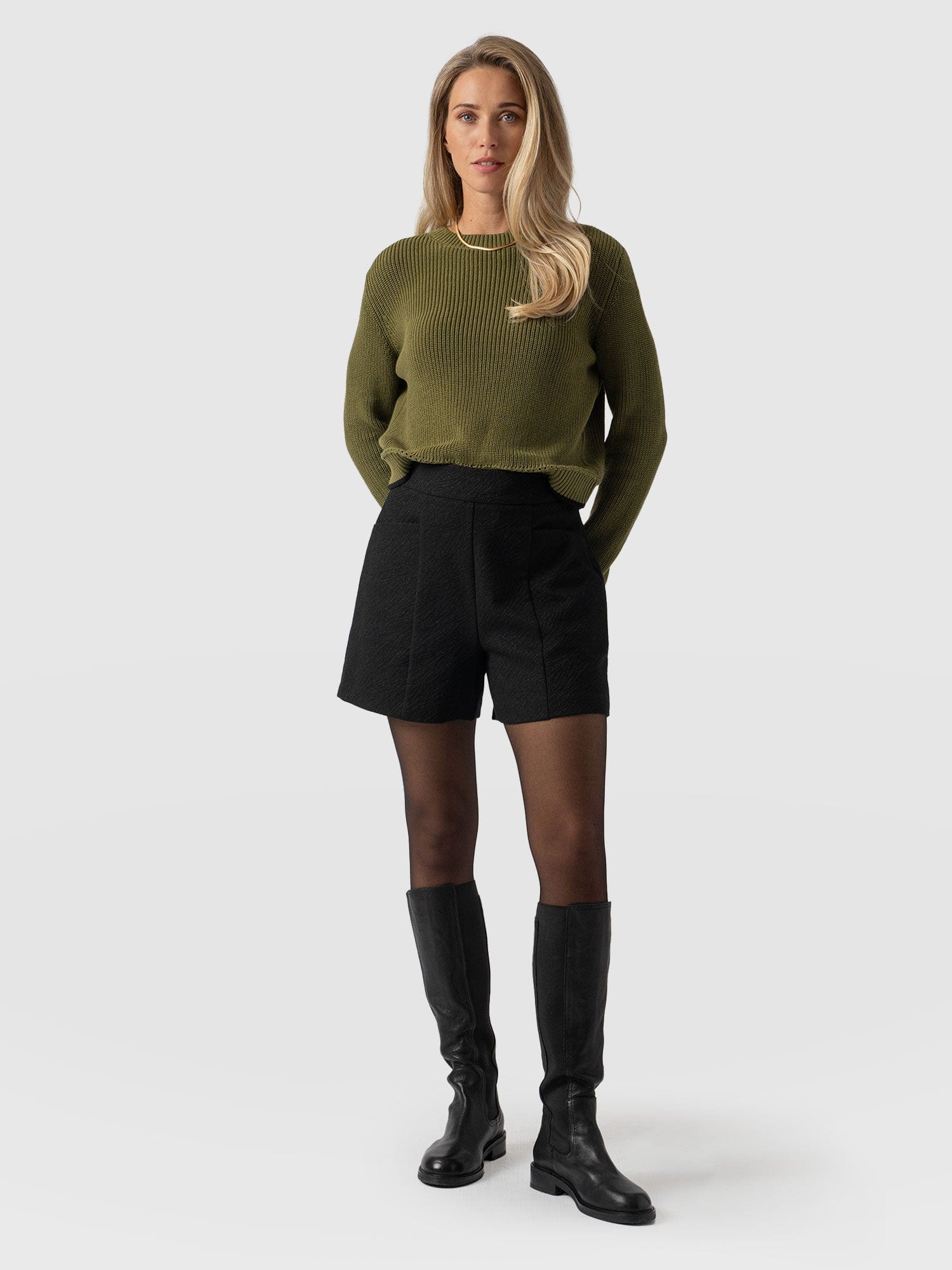 A touch of subtle safari paired with tailored elegance – that’s the secret behind the Ramone Shorts. This zebra jacquard pair is handmade by artisans in Europe using a soft and smooth cotton blend. The tonal animal print decorates the mid-waisted silhouette, which is topped by a structured waistband and finished with seam detailing to create a sophisticated edge. Pair yours with a chunky knit and knee-high boots to complete the look.