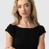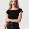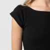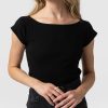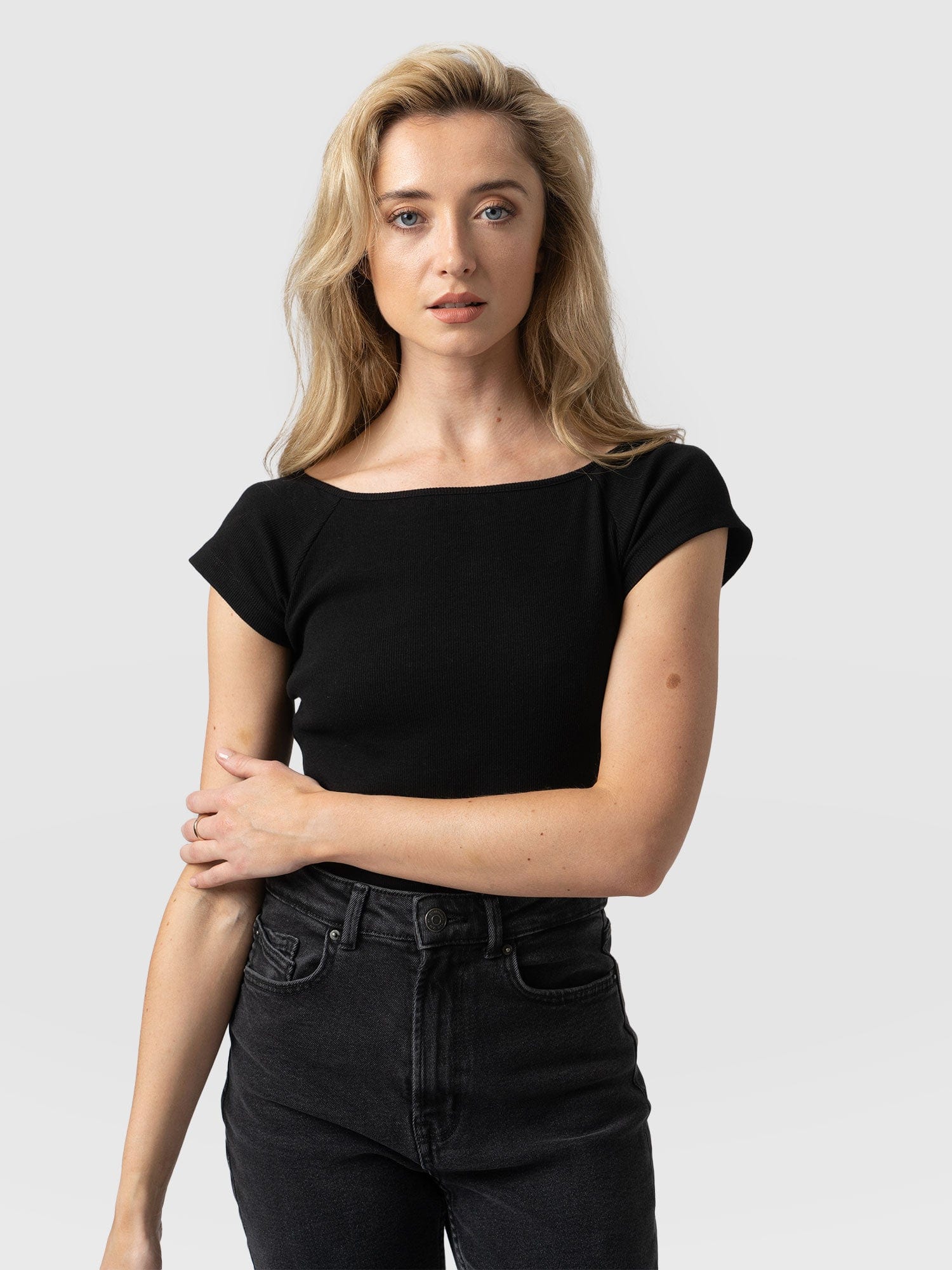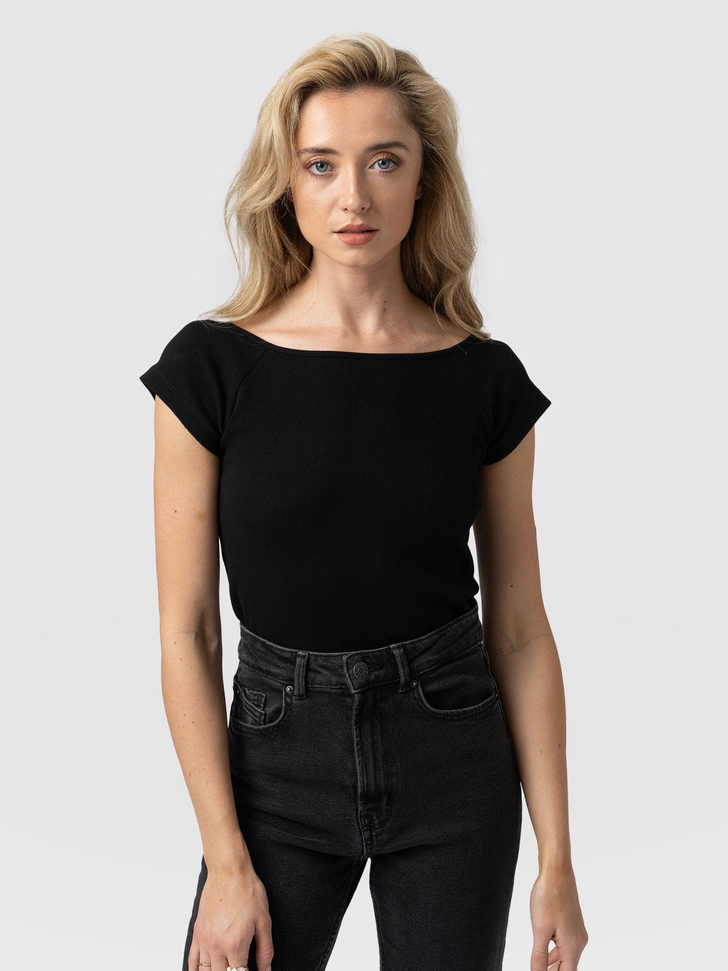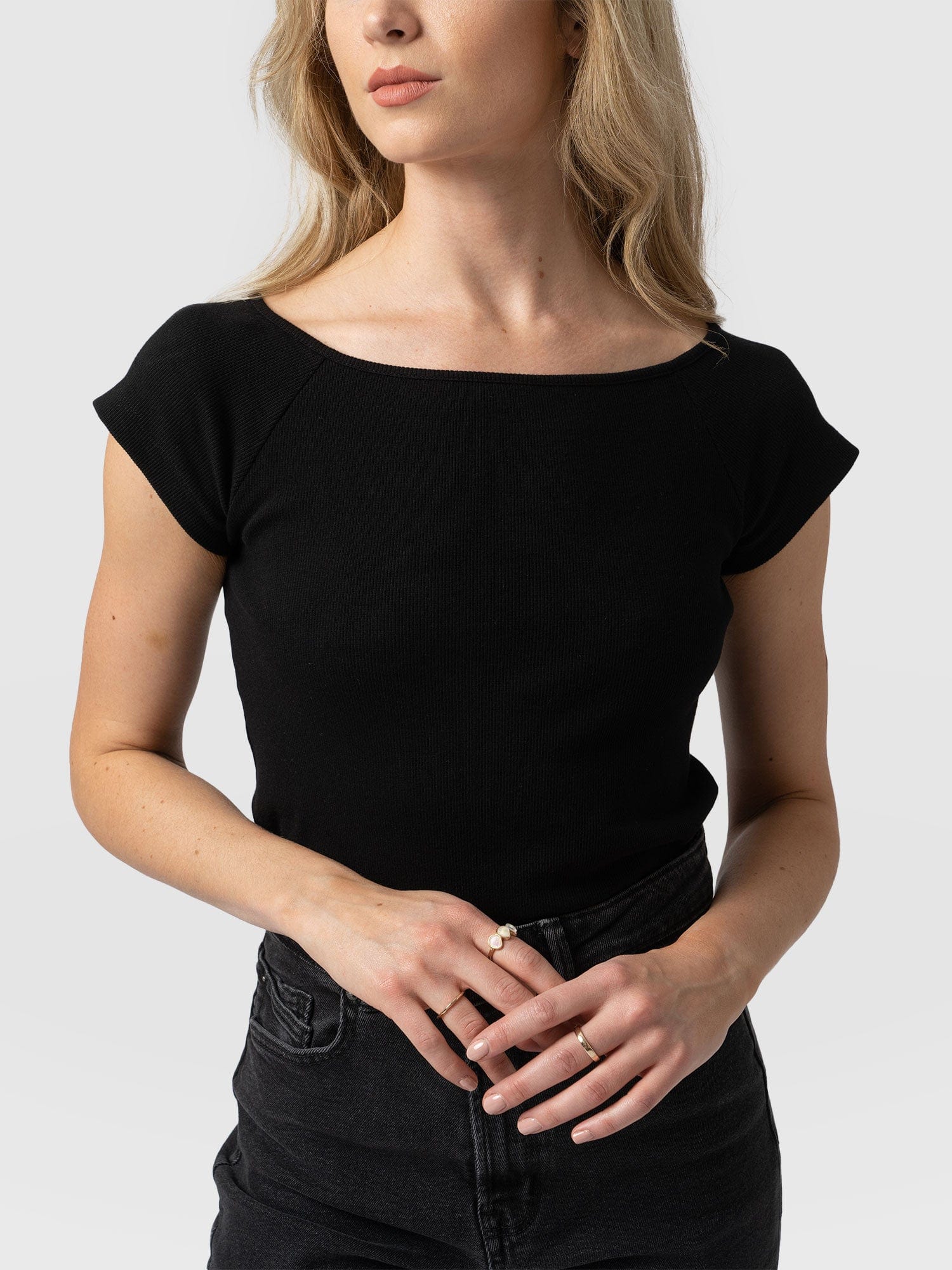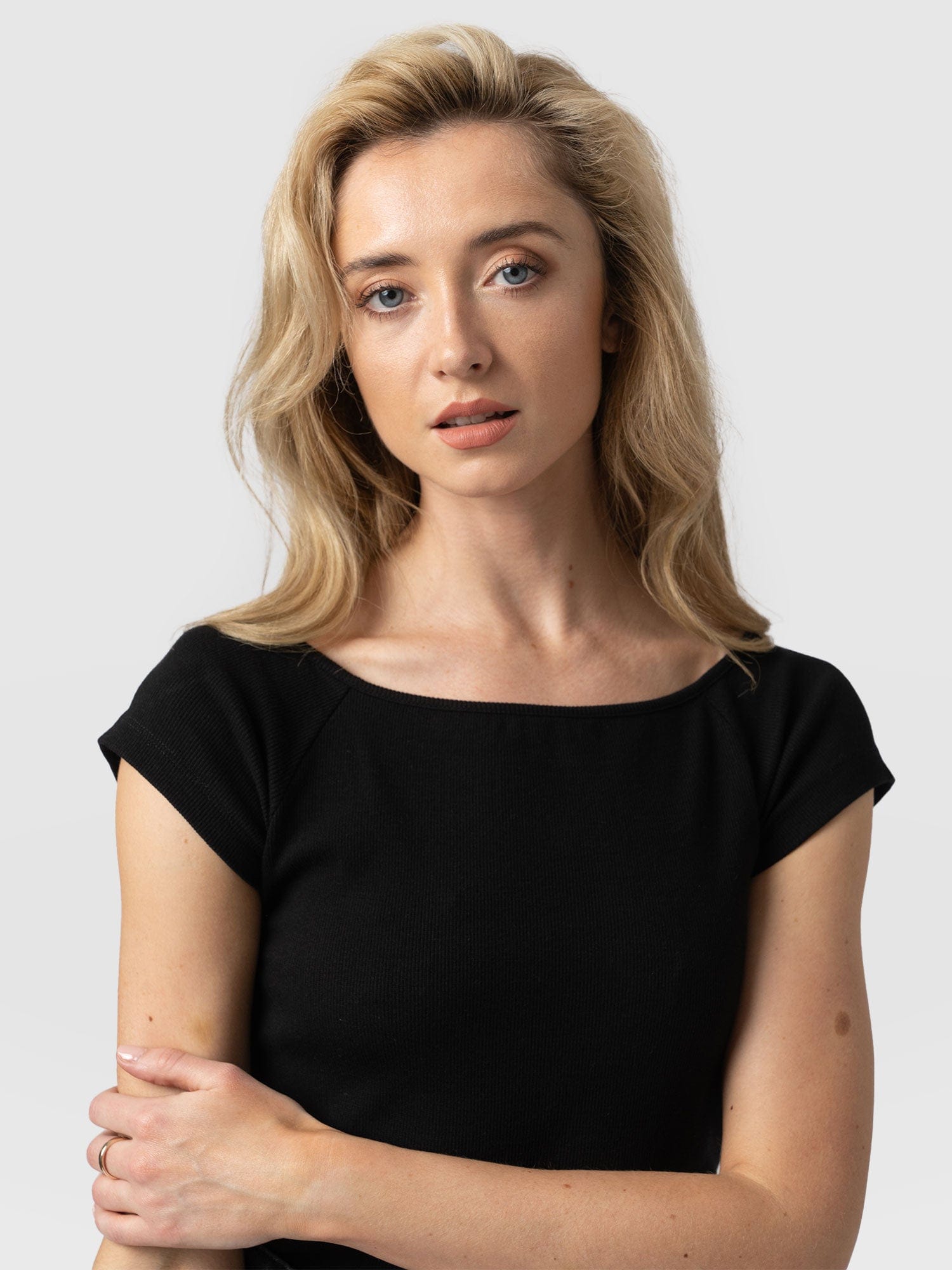 A classic tee in Black made with the softest organic cotton and a bardot neckline. Designed with a comfortable, slim fit and with a subtle rib construction. Perfect for warmer days and for layering. We make each one by hand in our studios in Europe for the perfect fit and feel.