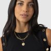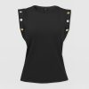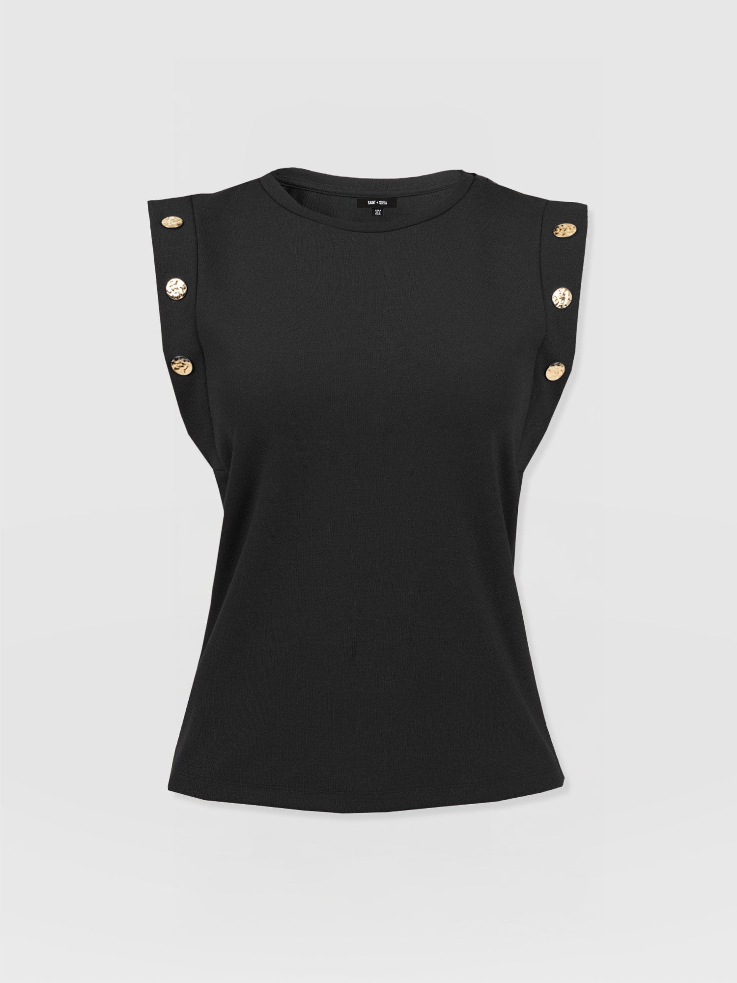 A staple T-shirt to add to your everyday collection, The Rowan Tee in Black is a casual design made from soft and gentle cotton. It’s shaped to a relaxed fit with a sleeveless frame to add some edge to the classic crew neck silhouette. At the sleeves, gold-toned molten buttons trace up the sides for a sophisticated touch. Pair yours with the Finsbury Pant or Wide Leg Jeans and your favourite trainers for a comfortable and always-on-trend look.