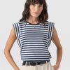 This nautical-inspired striped t-shirt in navy stripe features a relaxed fit and standard length, with added sophistication from the brushed gold button detail on the sleeves. Pair it with the Finsbury Pant or Adjustable Wide Leg Jeans and your favourite sneakers for a comfortable and trendy look.