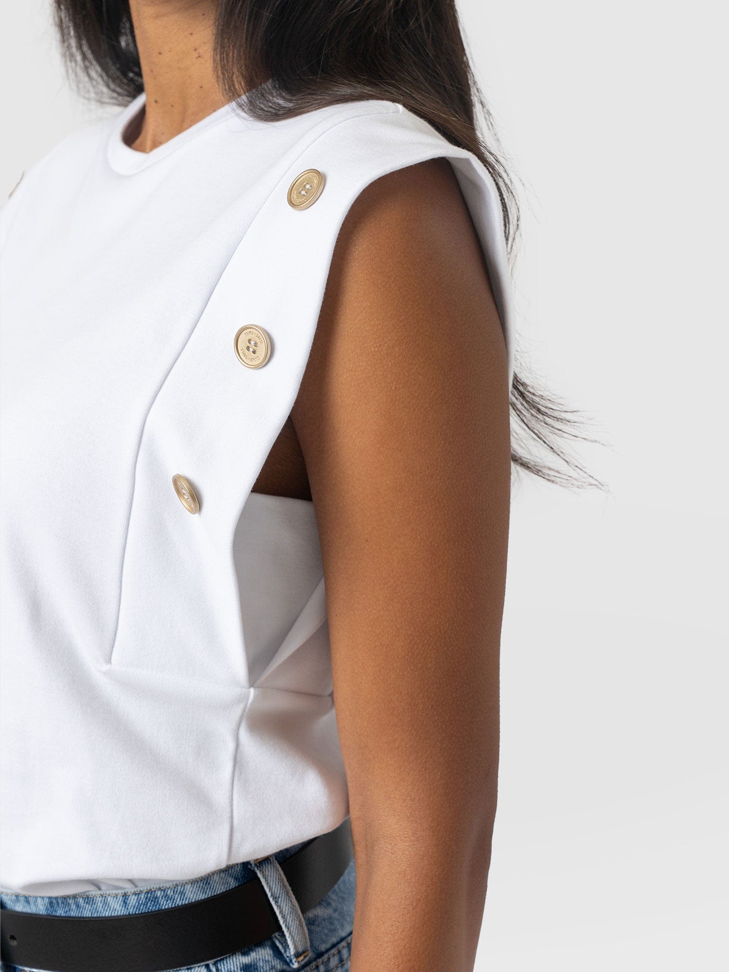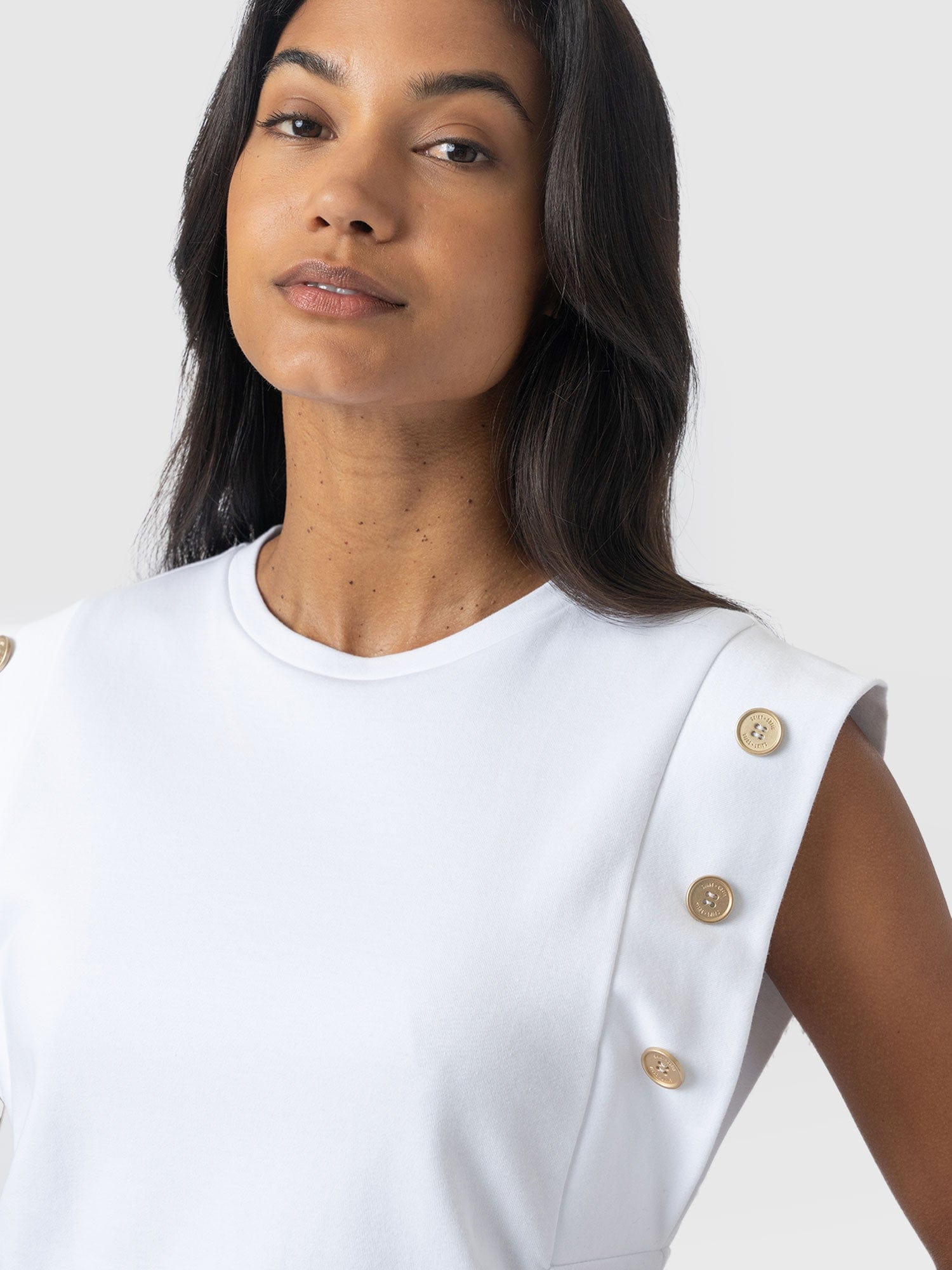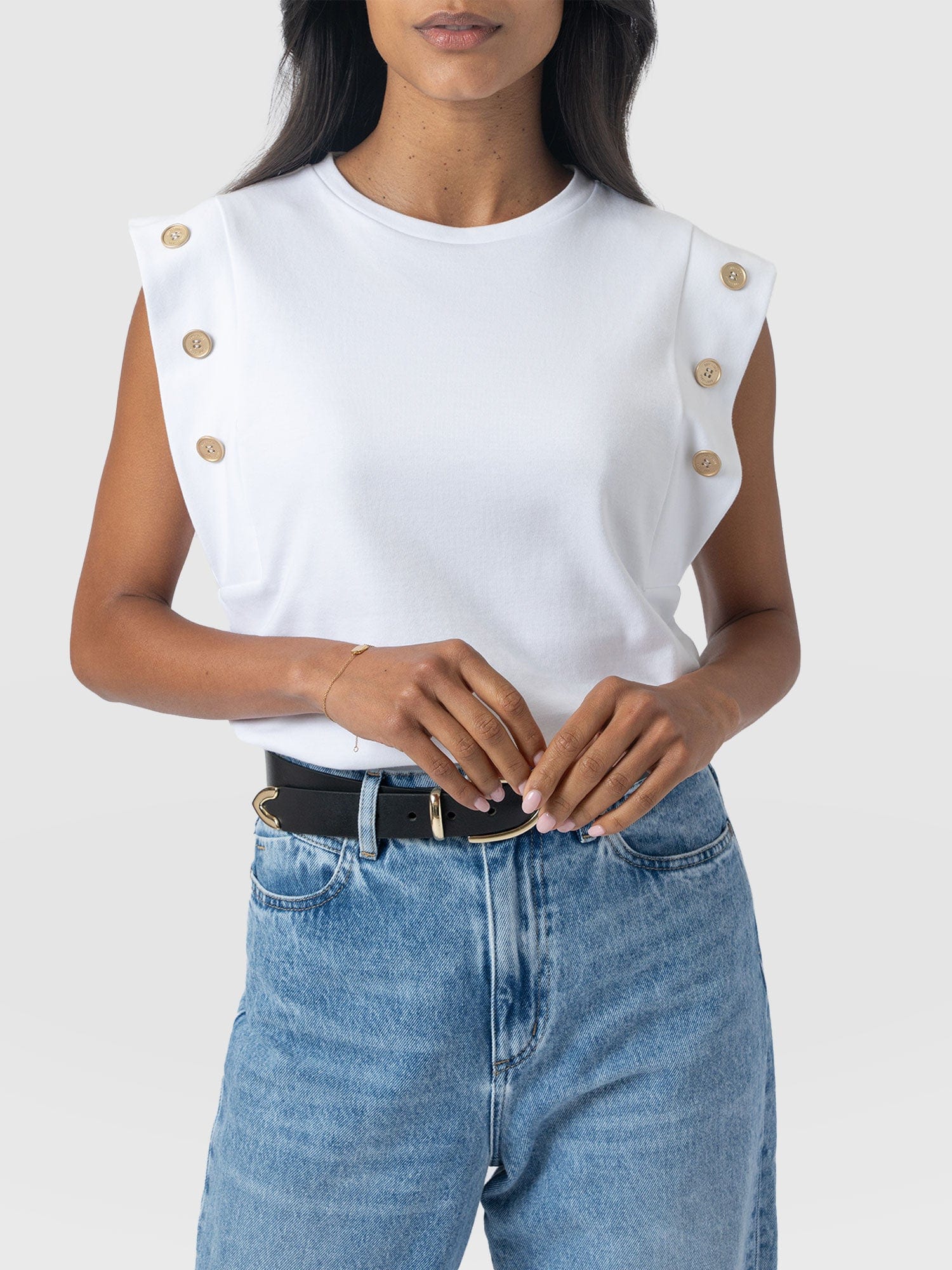 A staple T-shirt to add to your everyday collection, The Rowan Tee is a casual design made from soft and gentle cotton. It’s shaped to a relaxed fit with a sleeveless frame to add some edge to the classic crew-neck silhouette. At the sleeves, gold buttons trace up the sides for a sophisticated touch. Pair yours with the Finsbury Pant or Wide Leg Jeans and your favourite trainers for a comfortable and always-on-trend look.