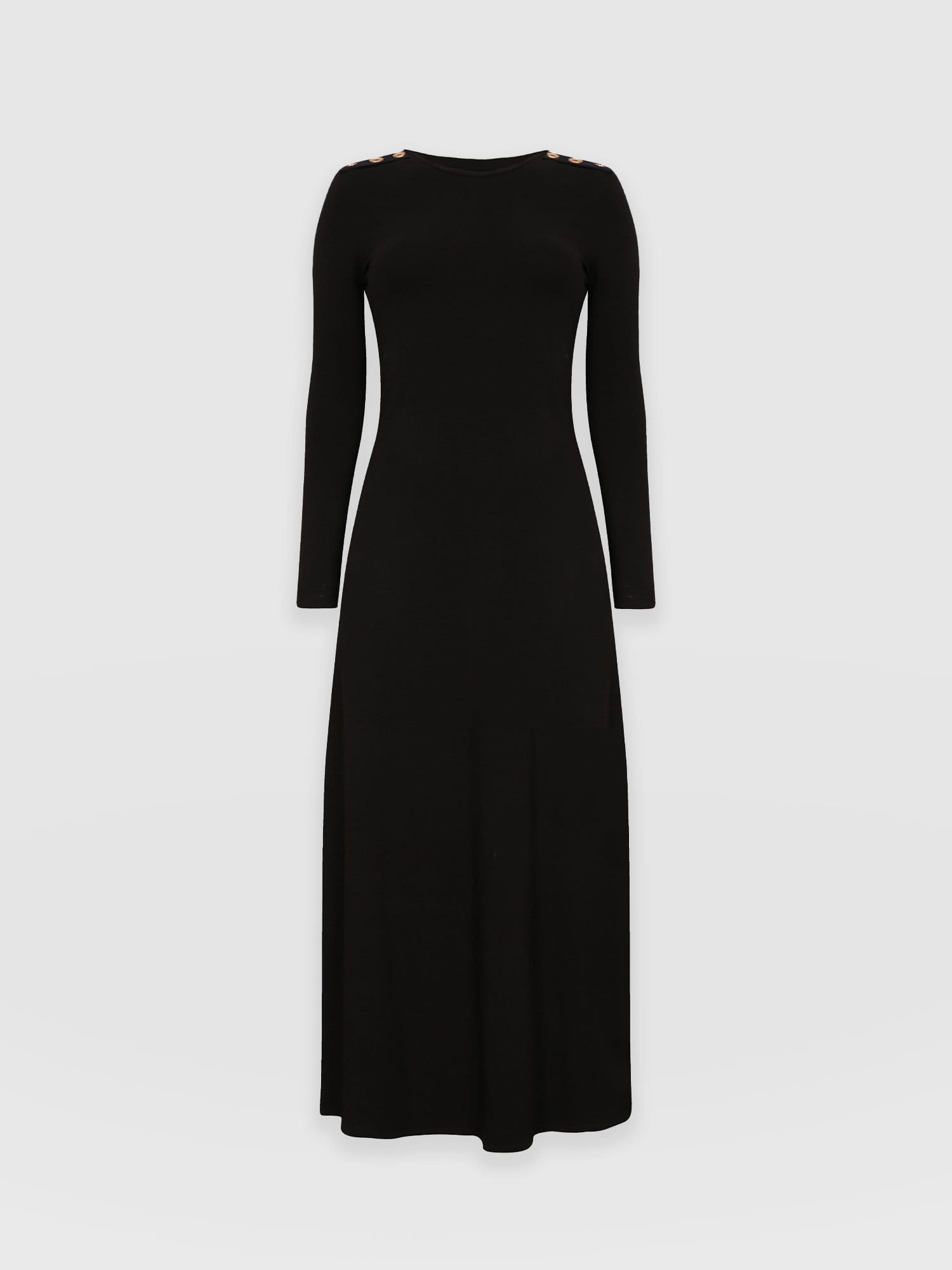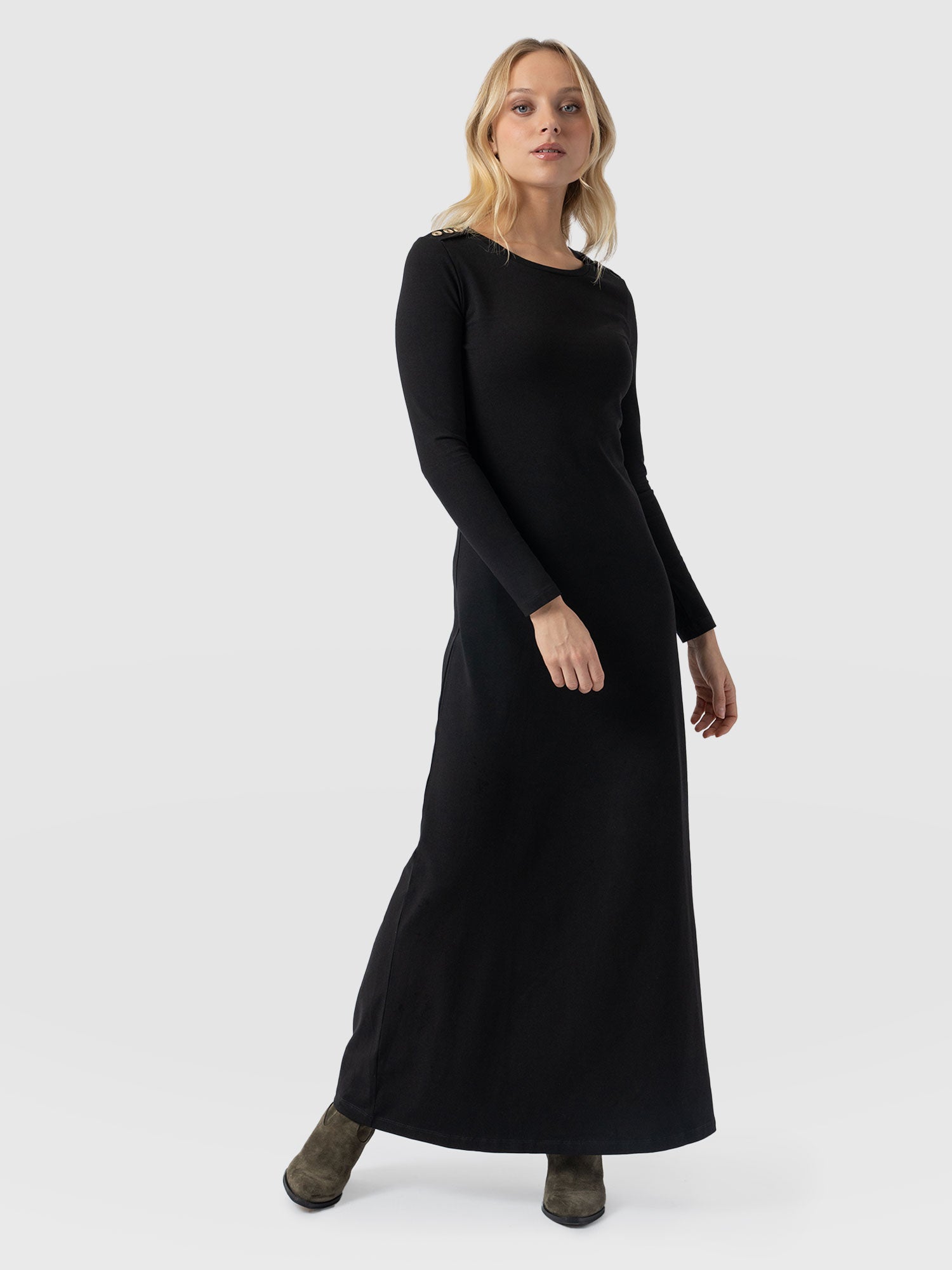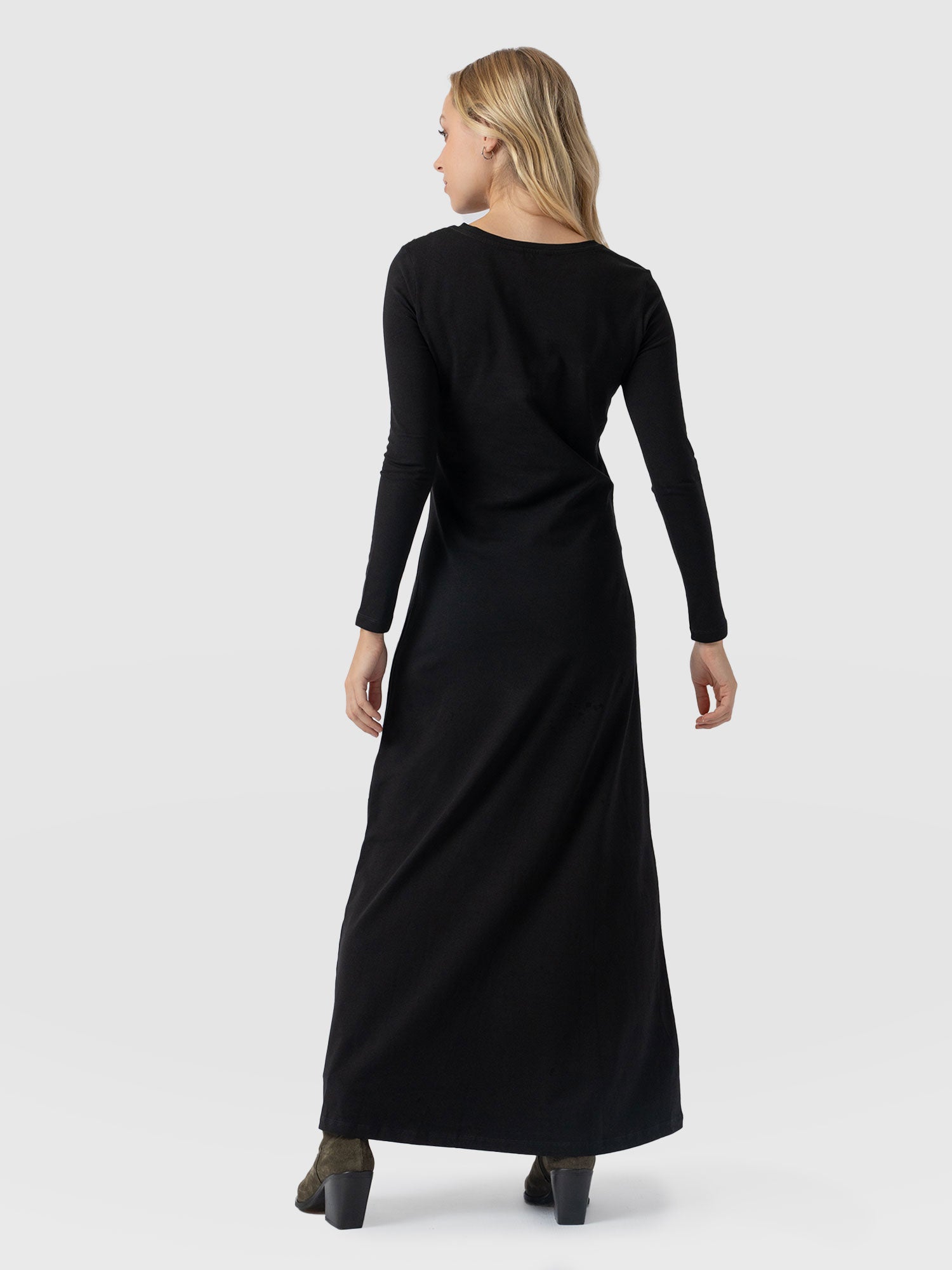 A comfortable maxi dress in black, made with the softest organic cotton and beautiful gold button detail. Designed with a figure hugging shape and with a full length. We make these individually by hand in our studios in Europe to ensure the perfect fit and feel that’s true to size. We use a soft, smooth organic cotton with a little added stretch. Pair with sandals, slides or sneakers for a casual look on weekends or with boots / heels for something a bit more formal.