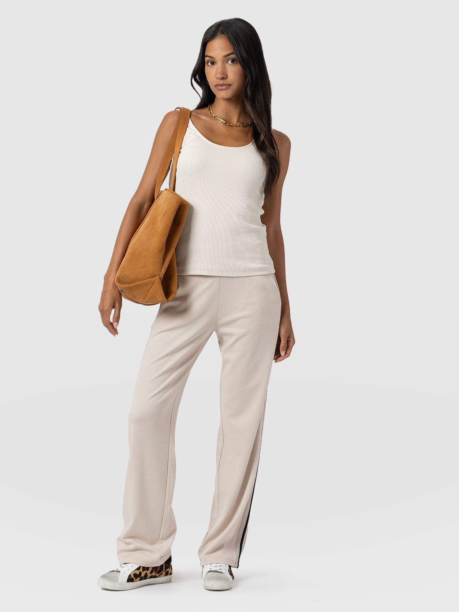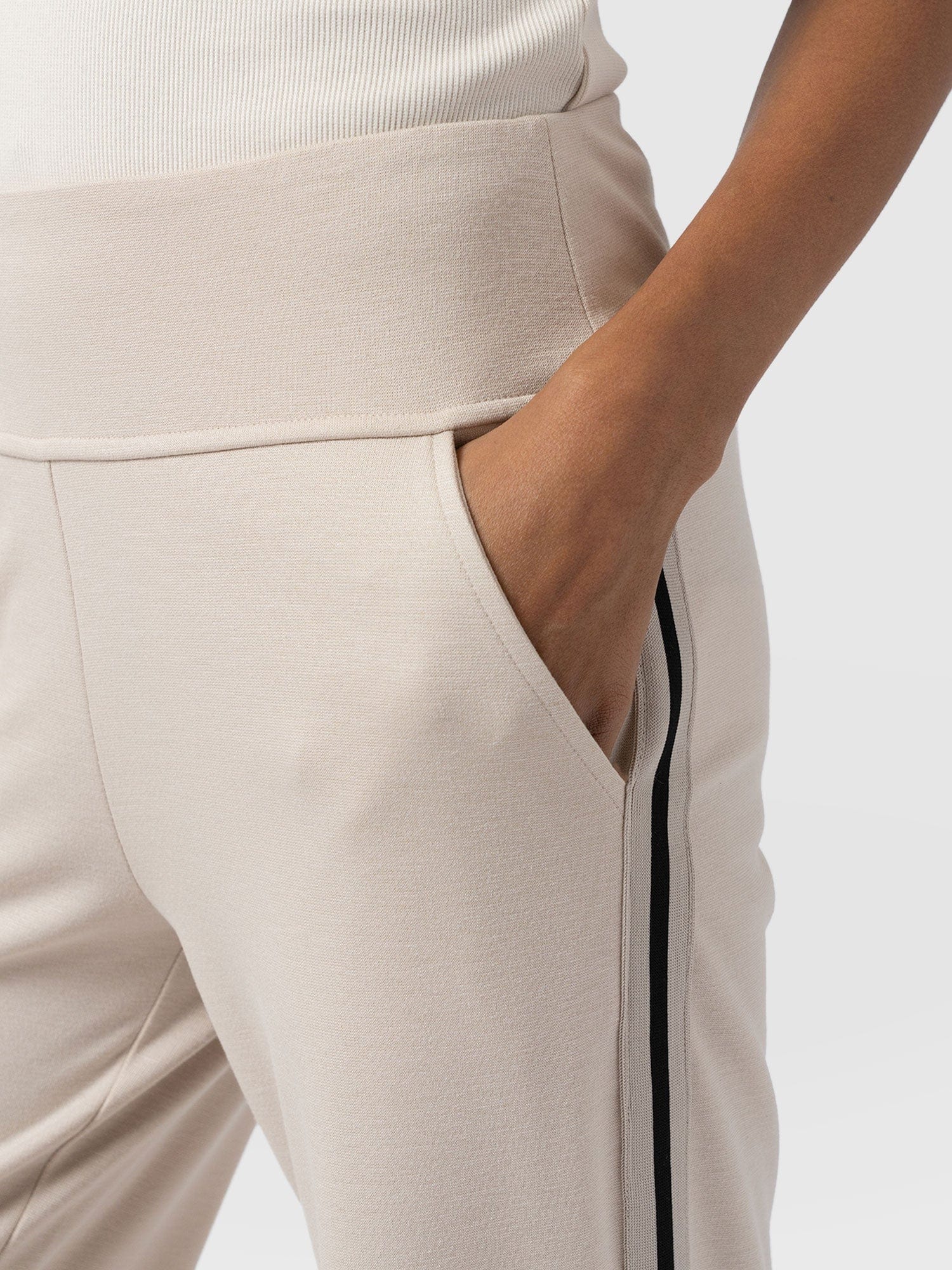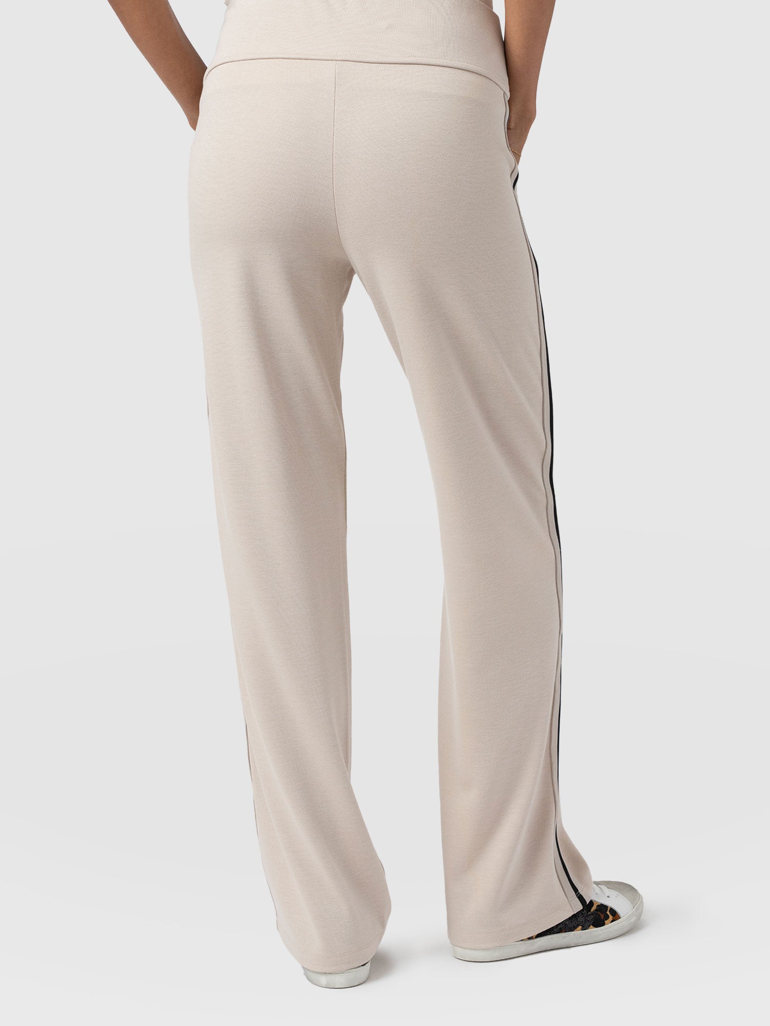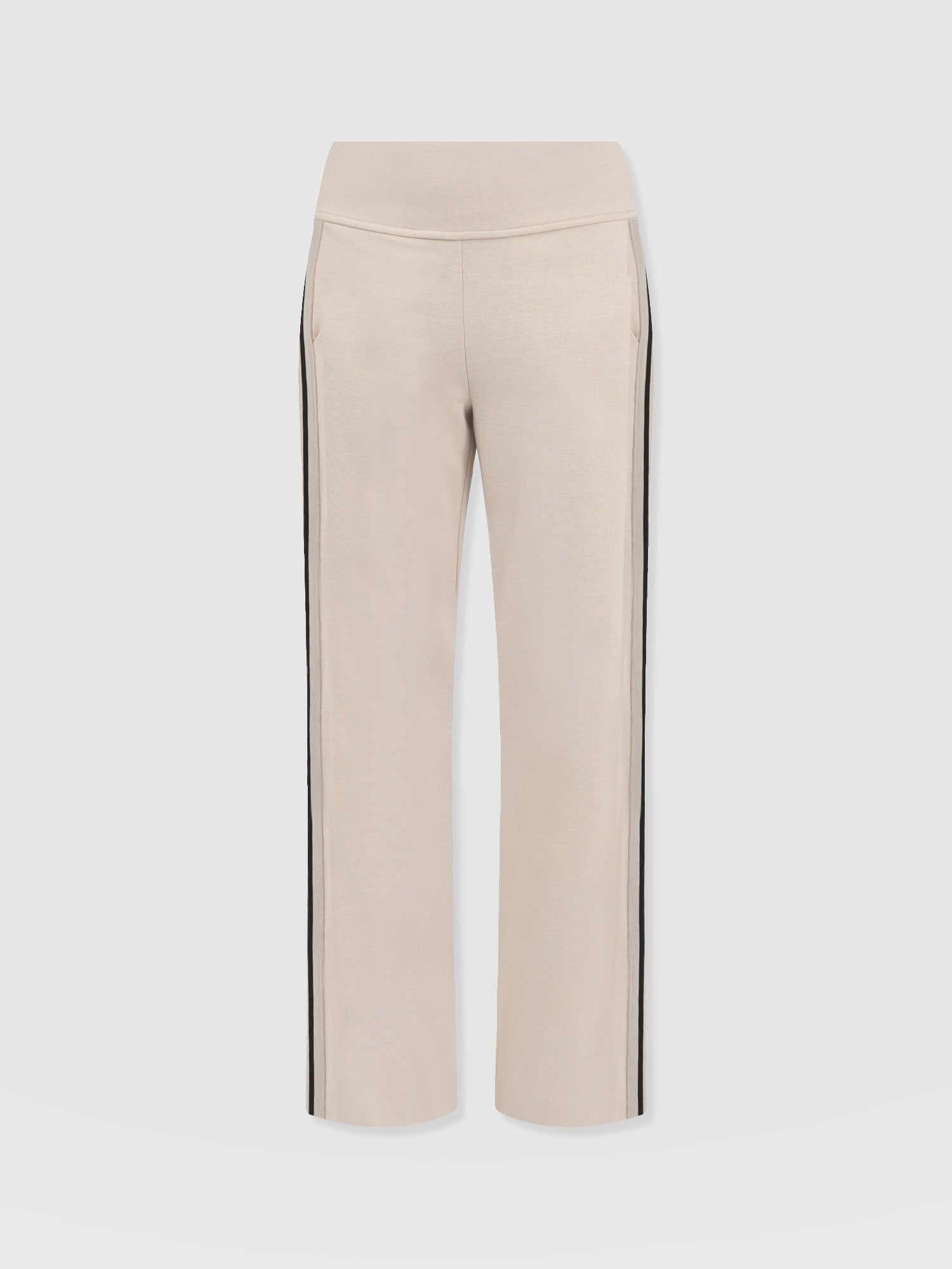The best selling Runway Pant in beige is a classic straight-leg pant style with a contrasting ribbon detail at the side. High-waisted and always in high demand, they’re infused with elastane for stretch. They’re smarter than jeans but comfortable like leggings. Each pair is made from soft and smooth Ponte Di Roma that has a beautiful drape and boasts a crease-free finish. Perfect for work or weekends, they pair with trainers for a casual look or with heels or boots for evening elegance.
