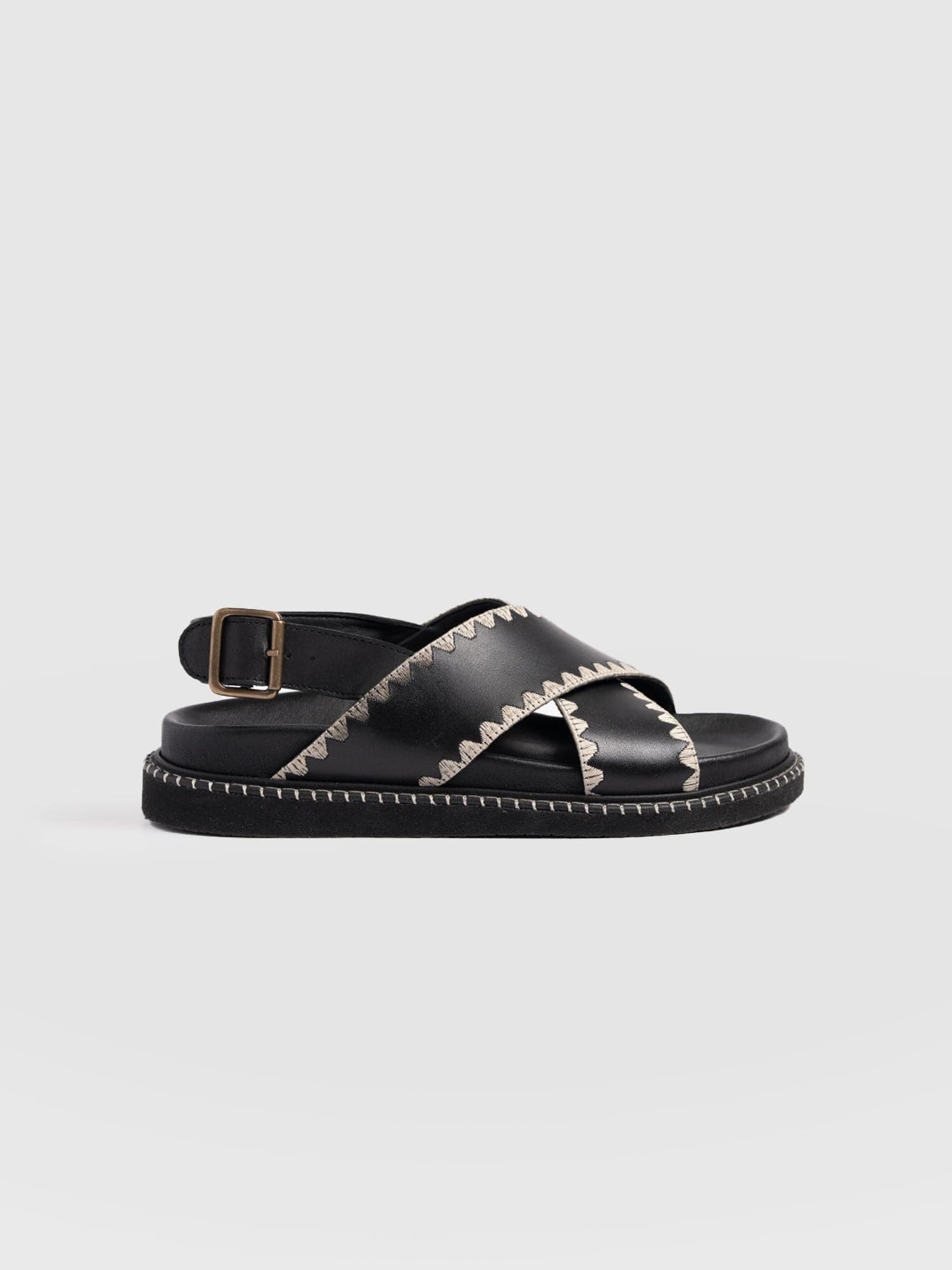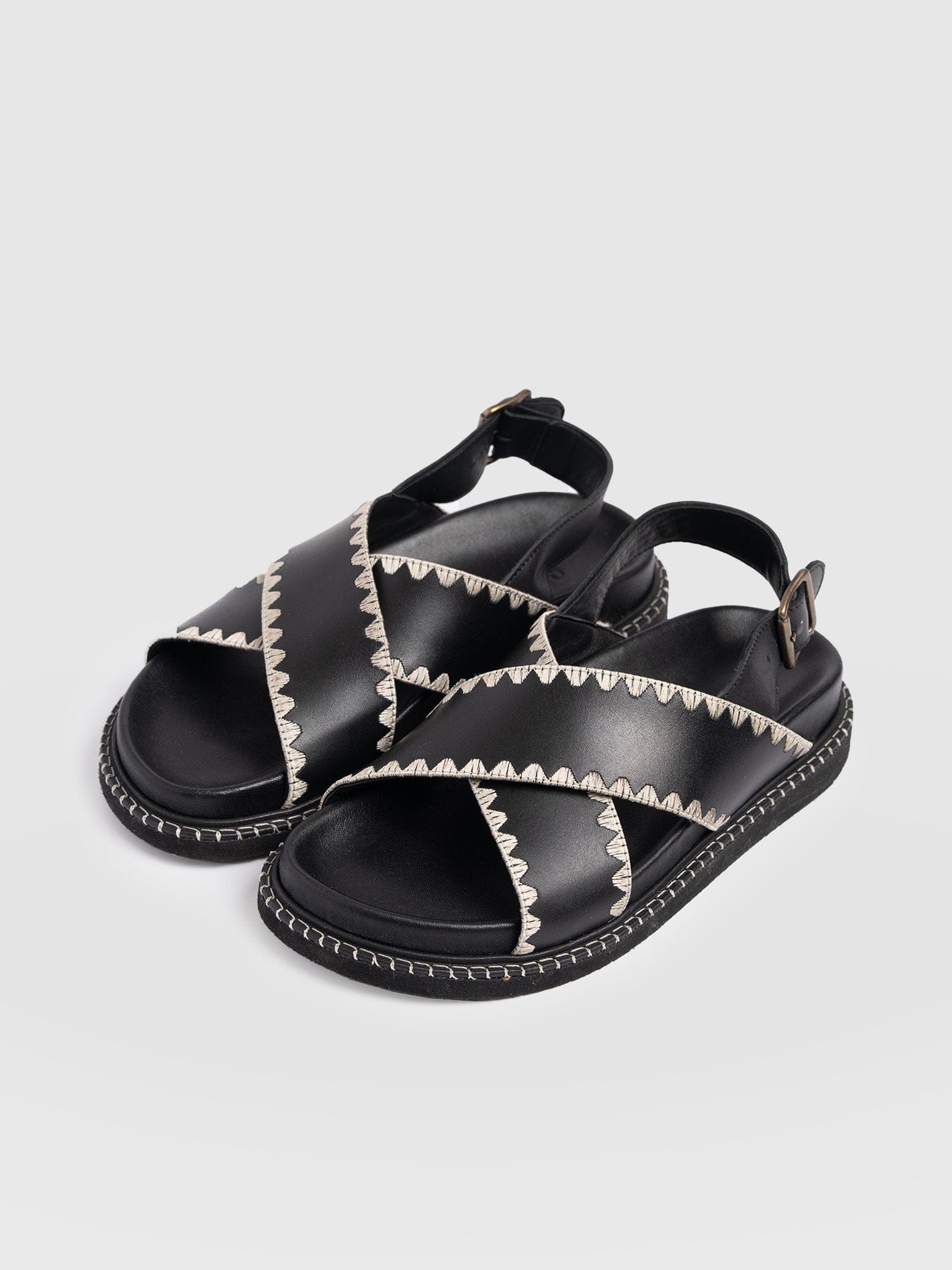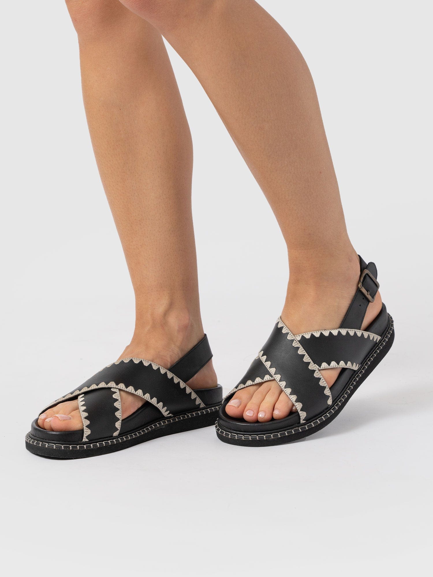 Meet the Bonnie Cross Over Sandals in Black. This laid-back style is designed with coastal towns and sun-soaked cities in mind. Handmade by our skilled artisans using Portuguese leather, they’re shaped to a classic round-toe silhouette and feature cross-over raffia straps with a chunky sling-back fastening for all-day comfort. Wear yours with skirts, dresses, or trousers.
