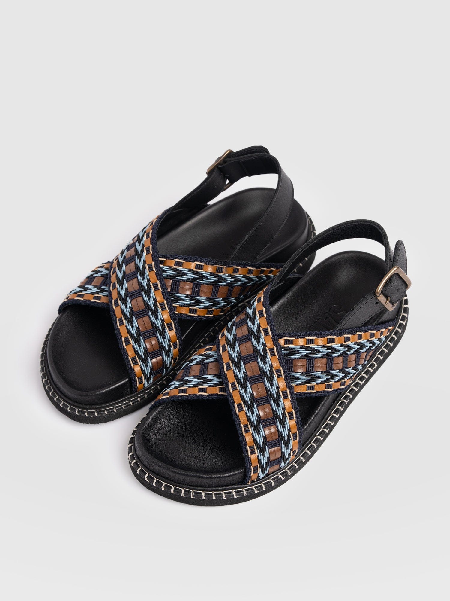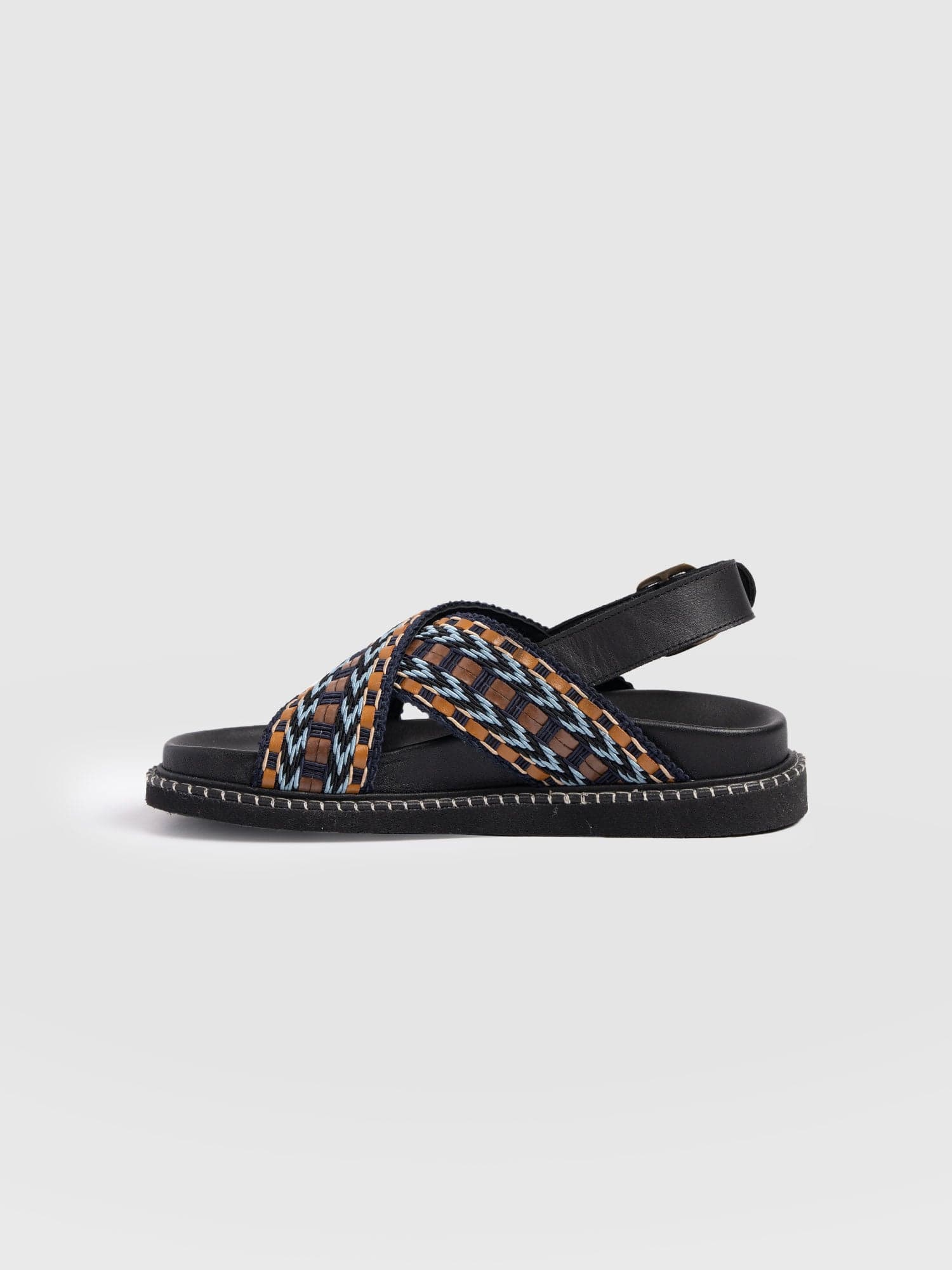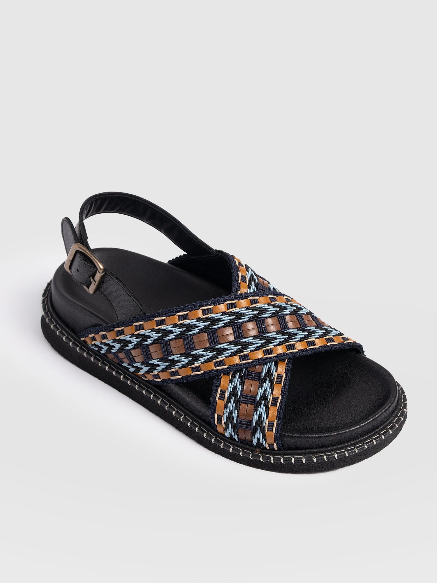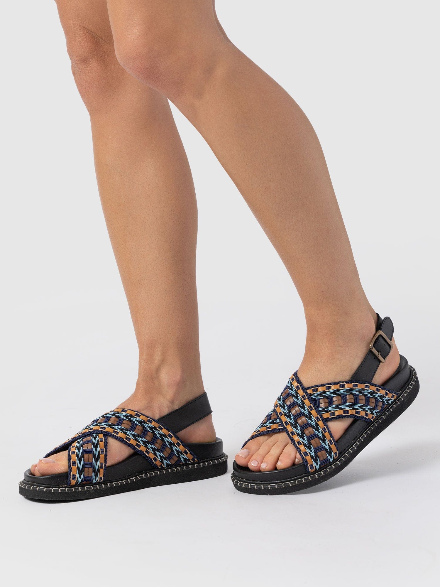 Meet the Bonnie Cross Over Sandals in Blue and Brown. This laid-back style is designed with coastal towns and sun-soaked cities in mind. Handmade by our skilled artisans using Portuguese leather, they’re shaped to a classic round-toe silhouette and feature cross-over raffia straps with a chunky sling-back fastening for all-day comfort. Wear yours with skirts, dresses, or trousers.