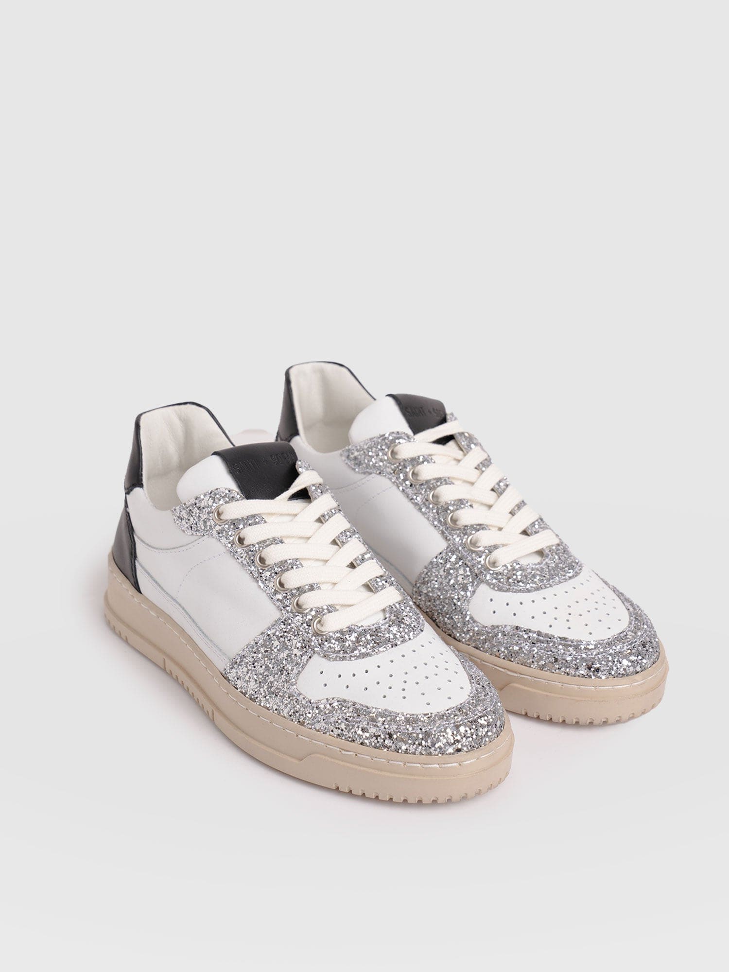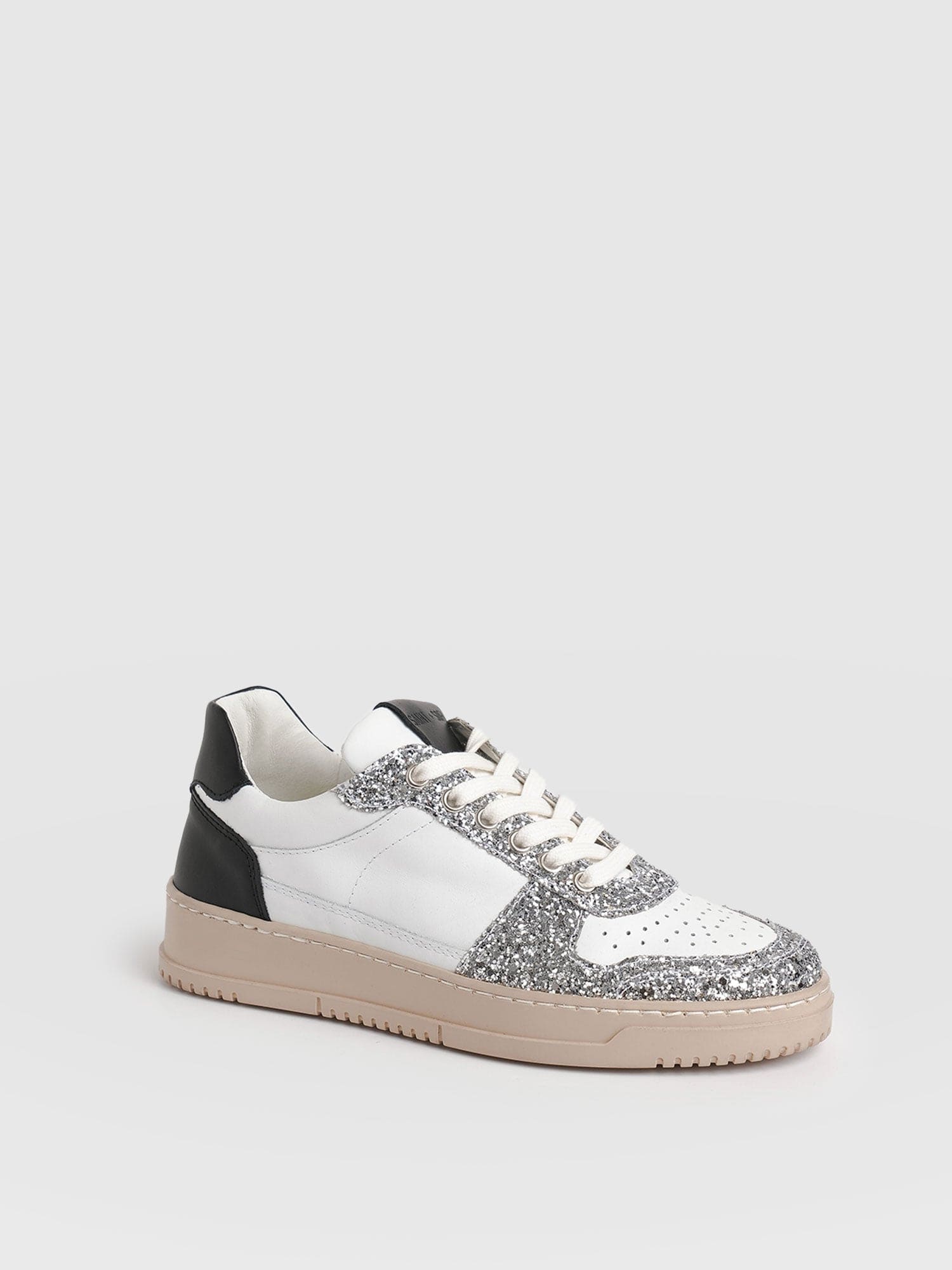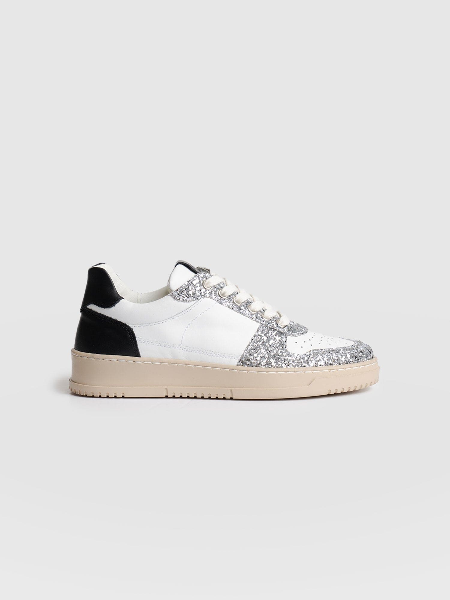 Taking the rough-and-ready skater sneaker and blending it with a glimmering edge, we introduce the Onyx Trainer. This lace-up design is handmade from smooth leather and shaped to a classic round toe design with a vintage-inspired sole. At the top, silver glitter panels bring sparkle to your look while the branded tongue tab adds tailored sophistication.