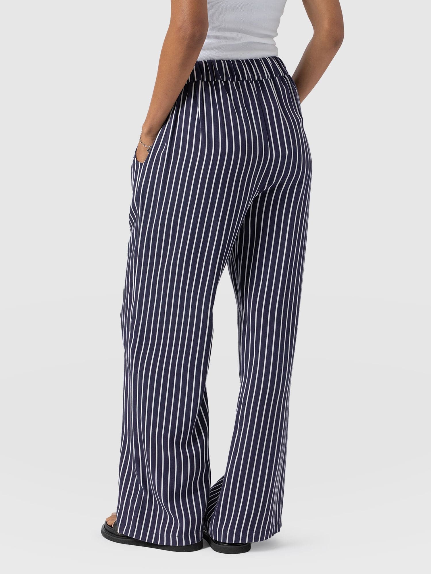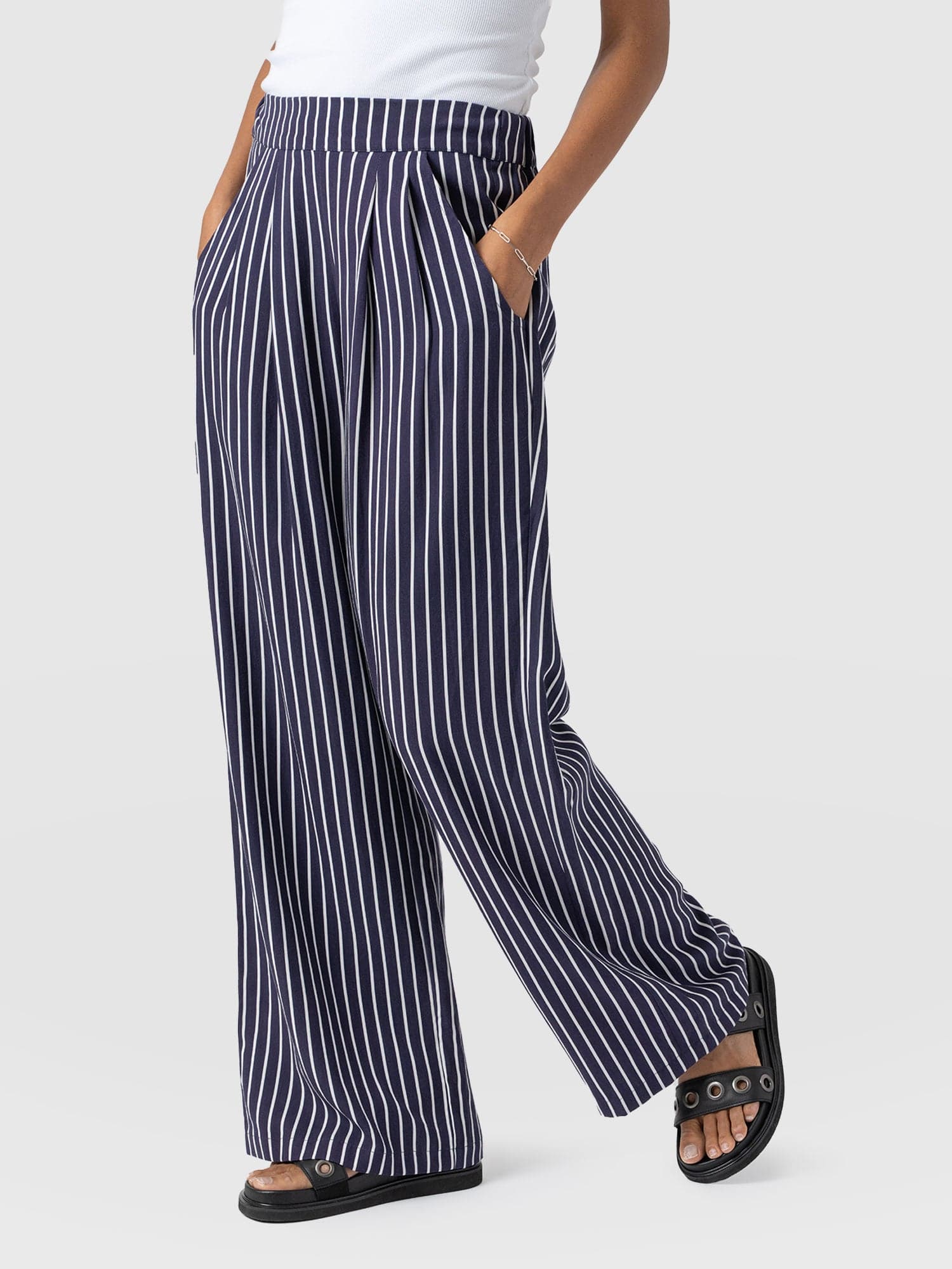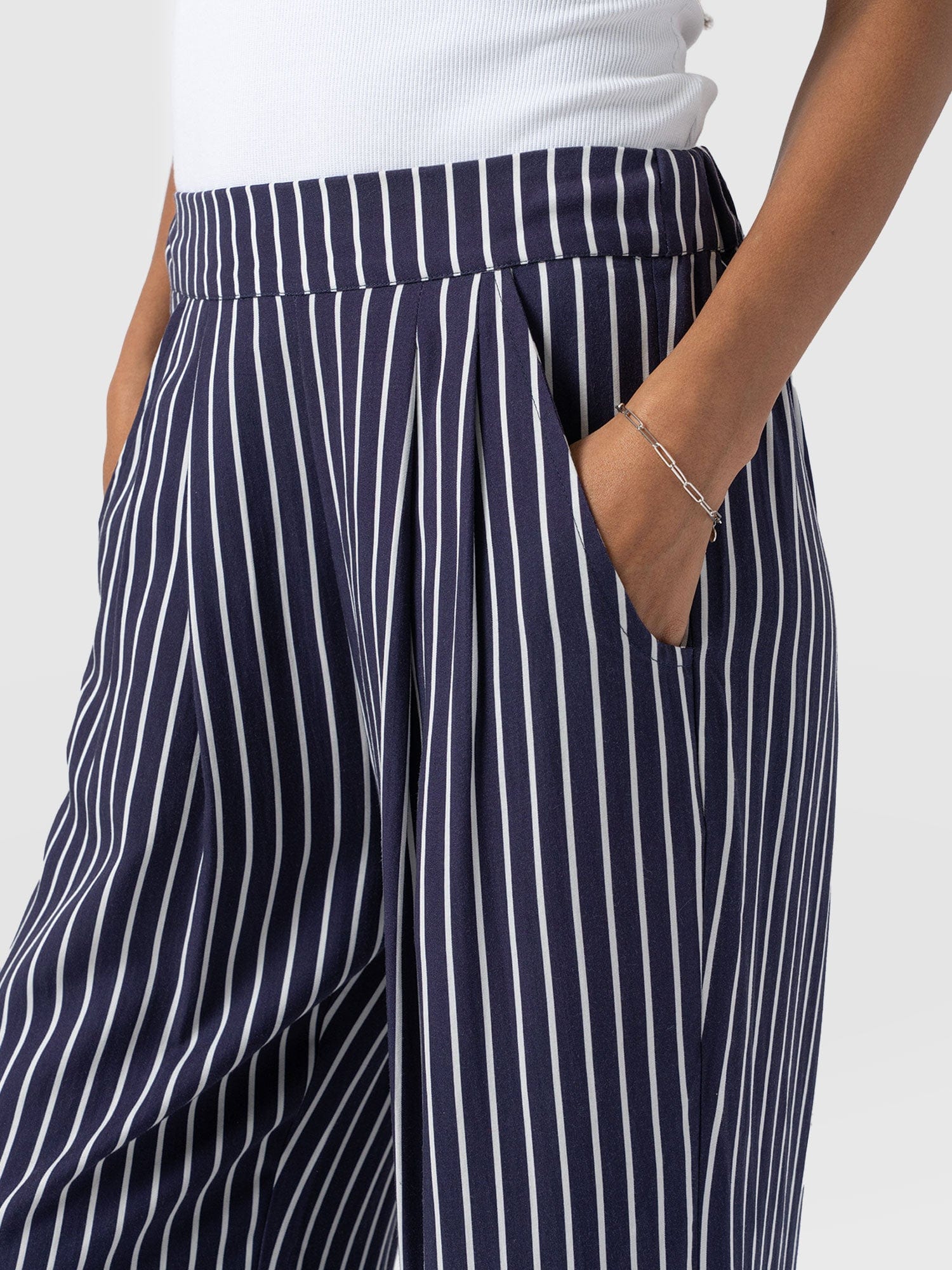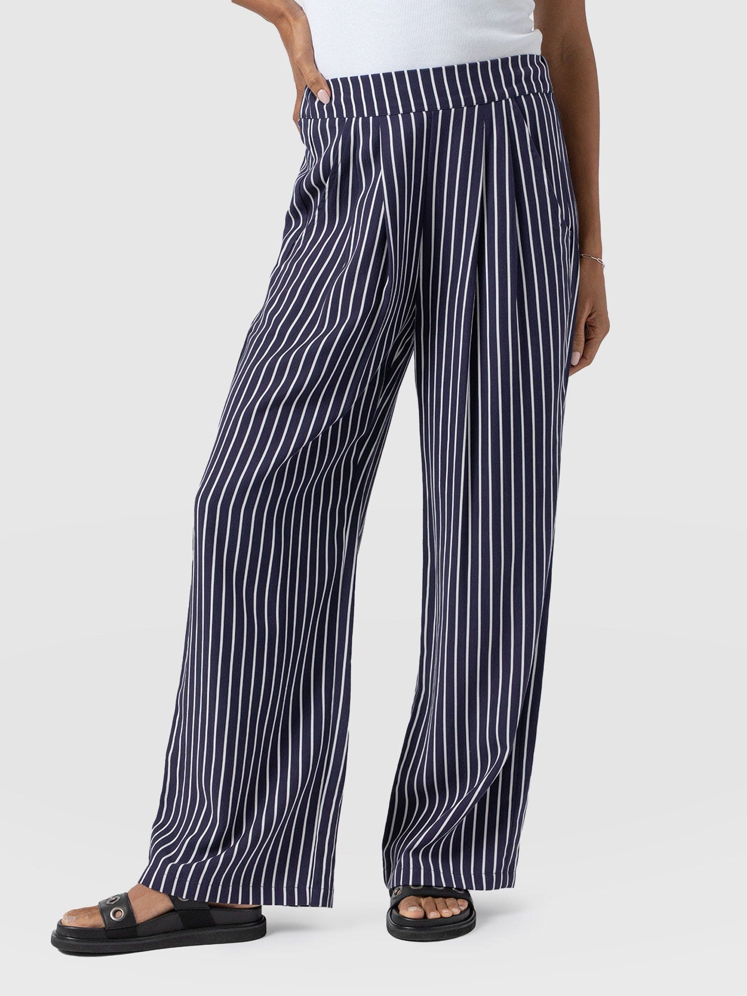 A comfortable classic, the Sloane Pant in navy mini stripe is a wardrobe essential. Made from soft and silky Tencel, this mid waisted pant has an easy pull-on elasticated back with a wide leg fit for extra comfort. Made with sustainable materials by hand in Europe. The front has pleats and pockets adding subtle detailing. Wear them for work or for weekends and style them with a white tee, navy blazer and white sneakers. Complete the look with a Mini Penny Tote Bag.