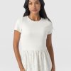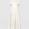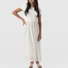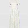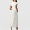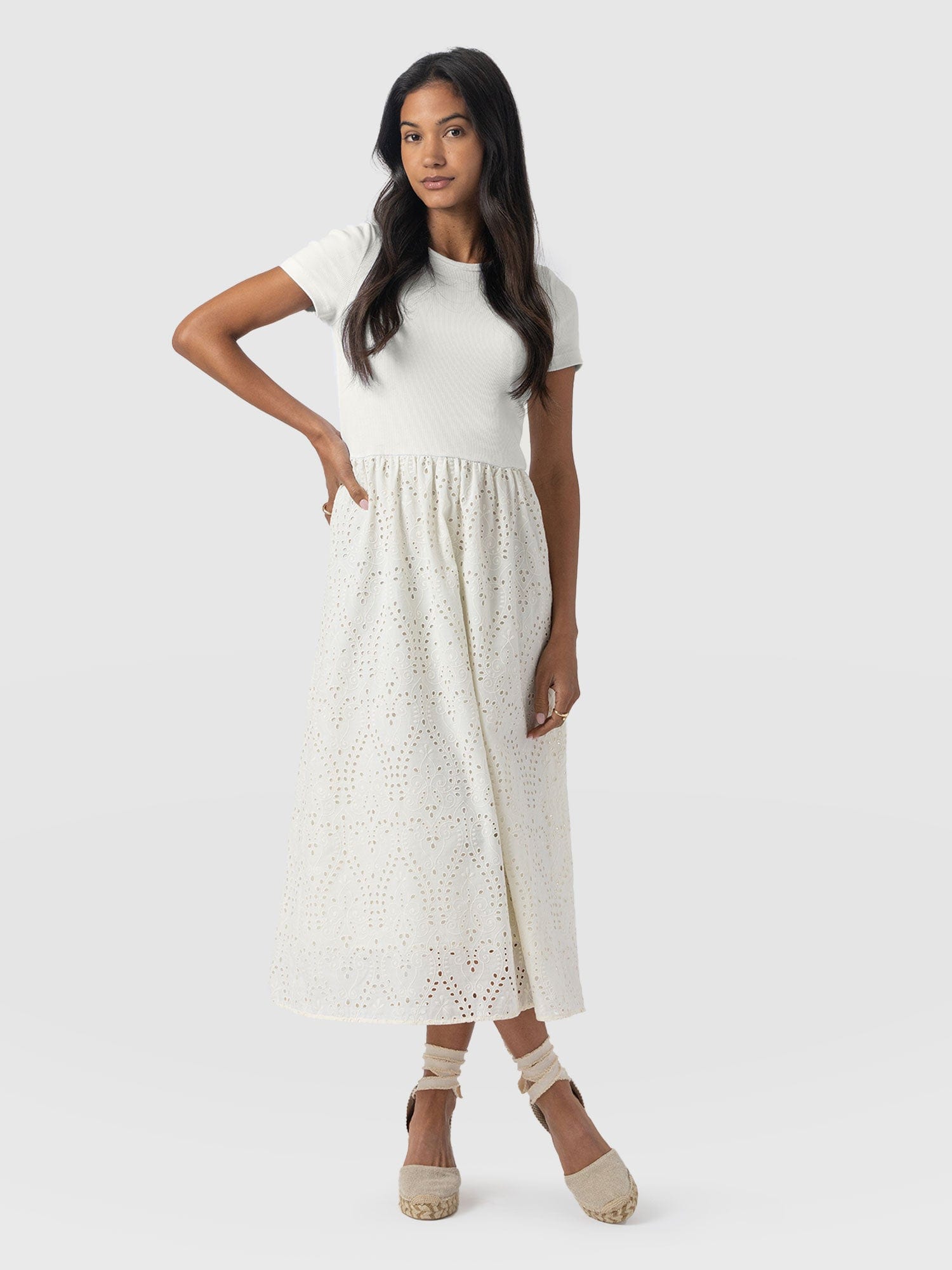 A co-ord effect midi dress. The Sophia Contrast Dress in white is handmade using a soft and smooth short-sleeve jersey bodice against a delicately detailed broderie anglaise skirt. Designed in London, this statement piece is perfect for styling with our Bridget Sling Back Heels and a jacket of your choosing.