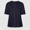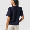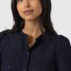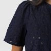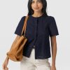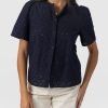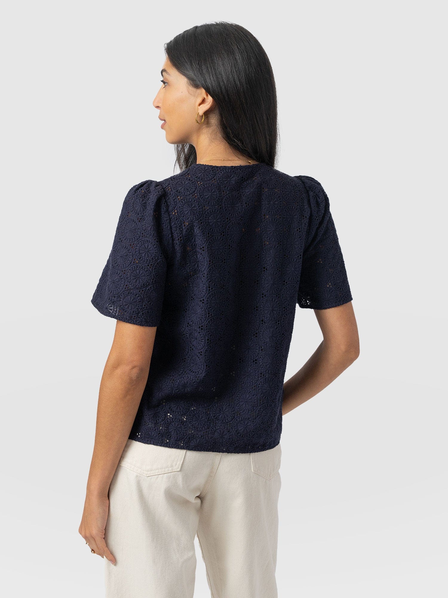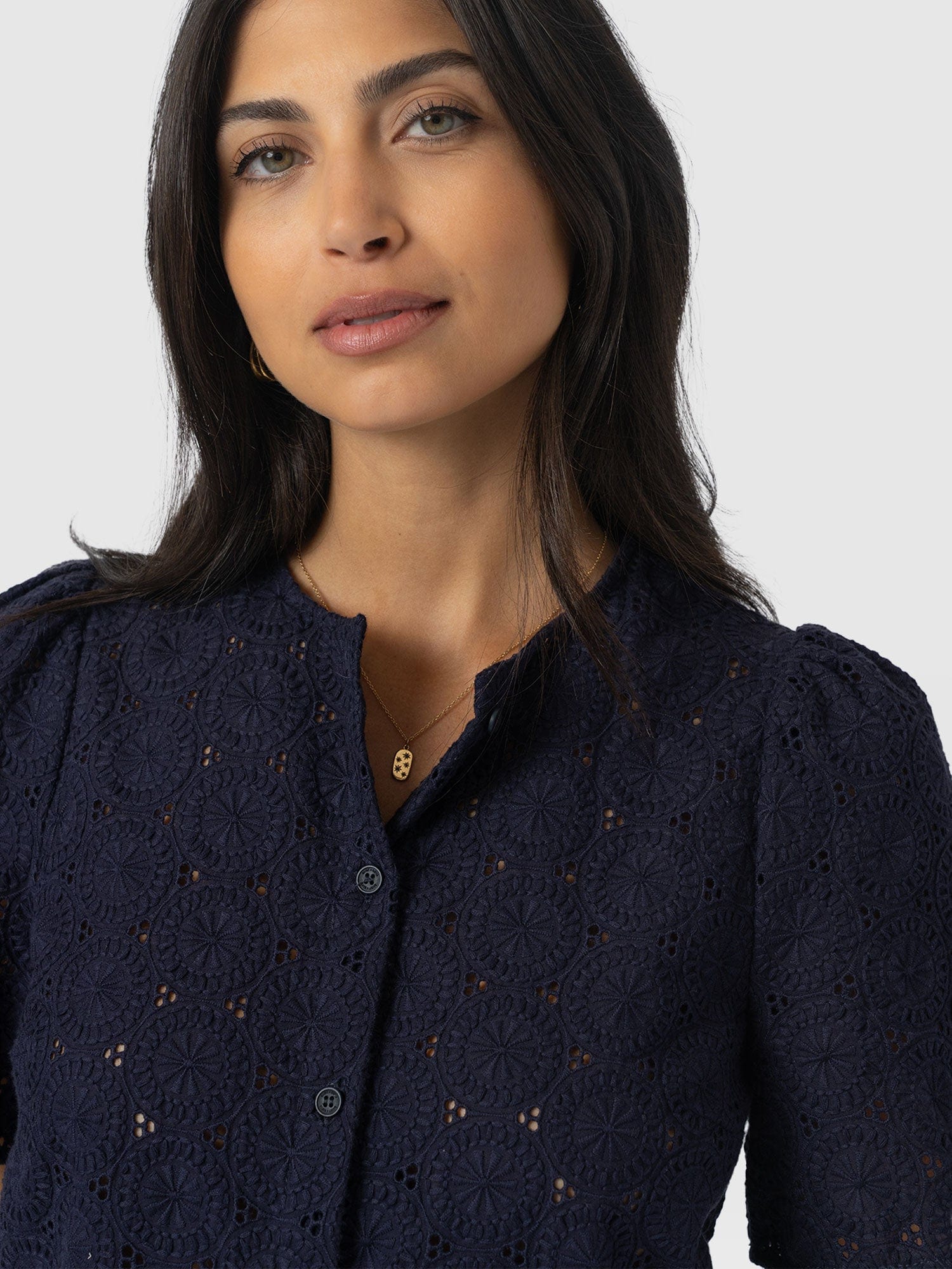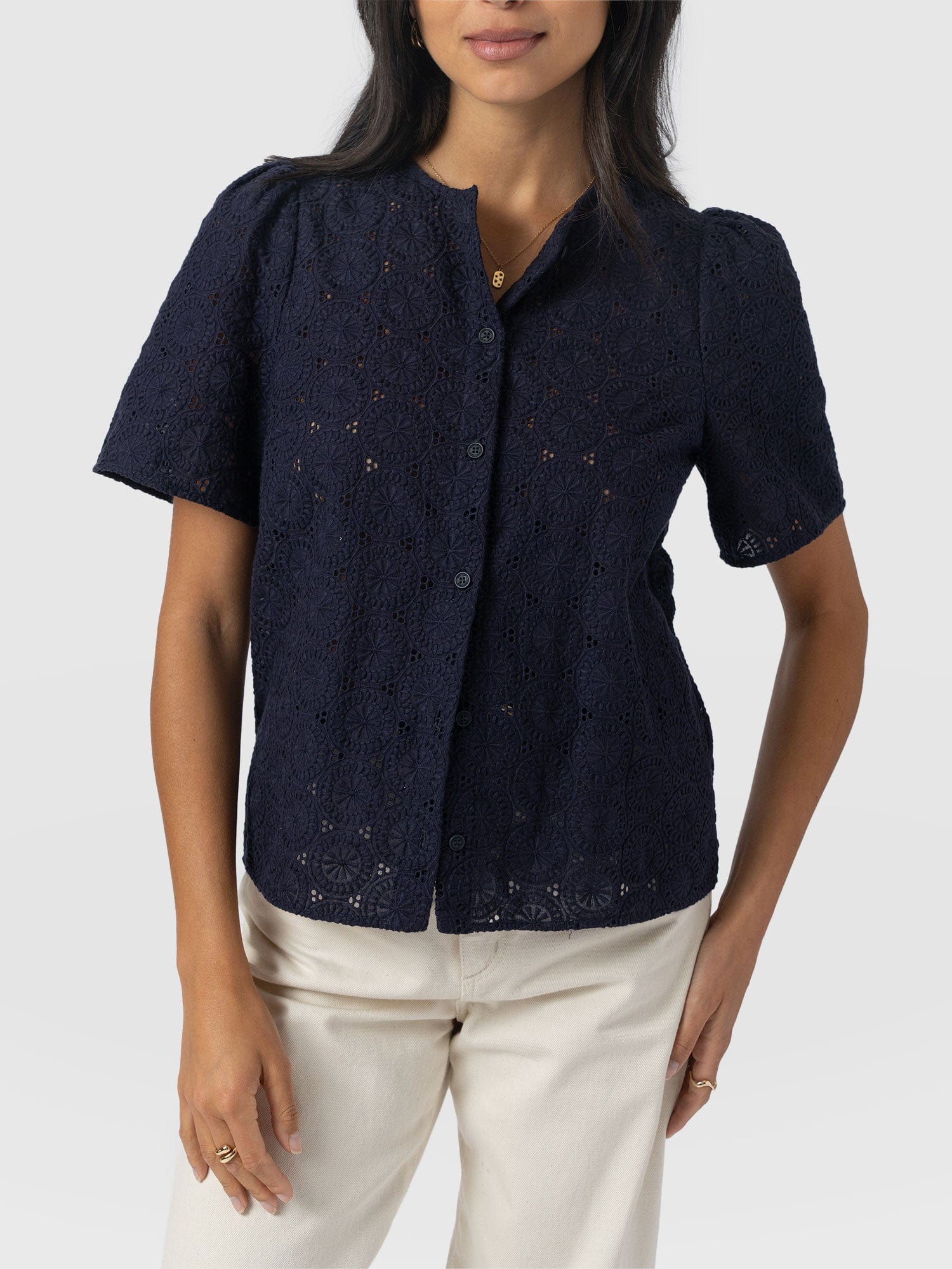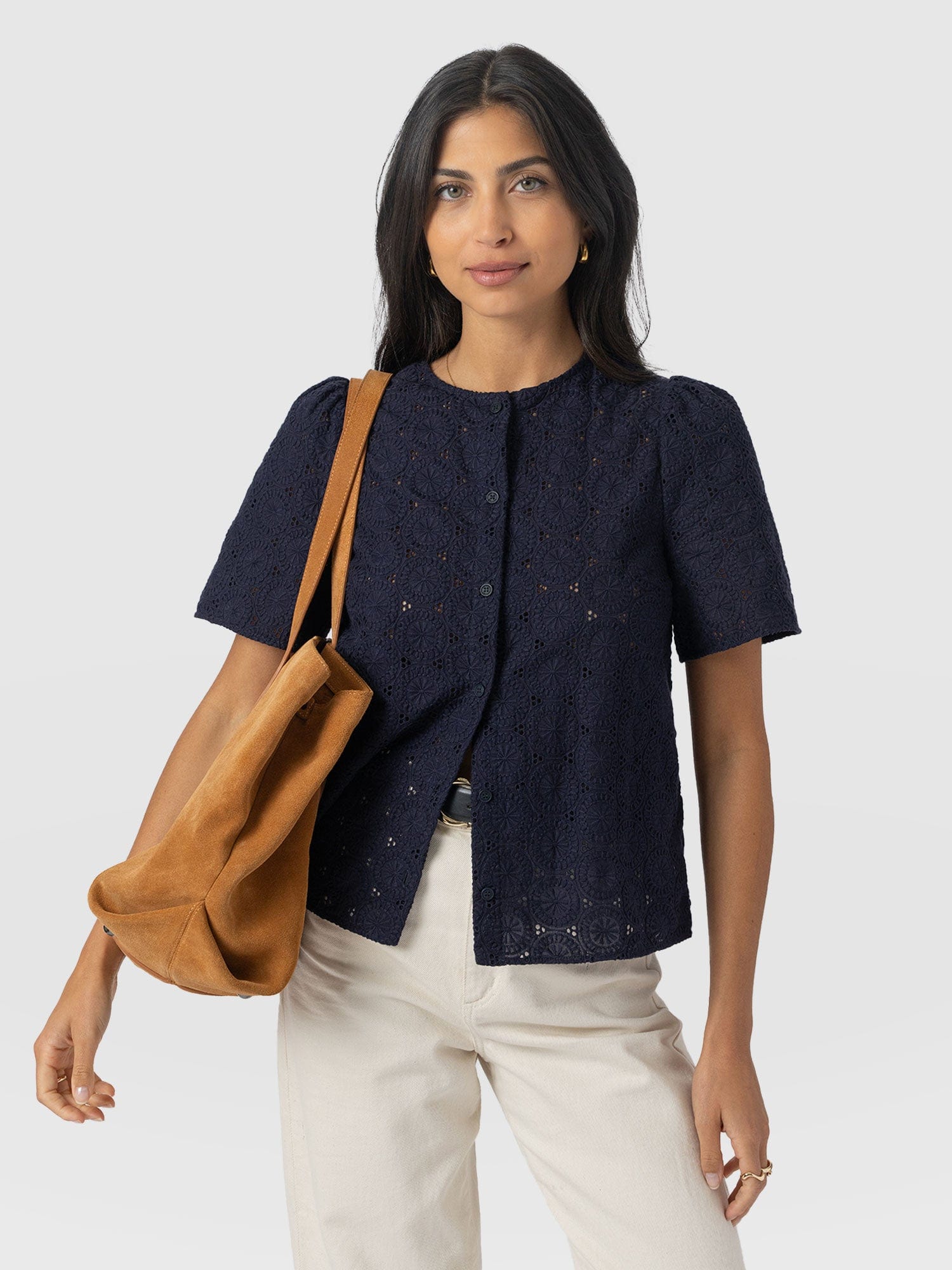 A short-sleeve blouse that’s perfect for any occasion. The Tabitha Blouse in Navy is masterfully handmade using organic cotton and shaped to a classic button-up shirt style. The neckline forgoes the traditional collar for a more casual crew neck while the lightly puffed sleeves add a hint of elegance. And to tie everything together with a beautifully chic finish, it’s decorated in broderie anglaise for a semi-sheer look.